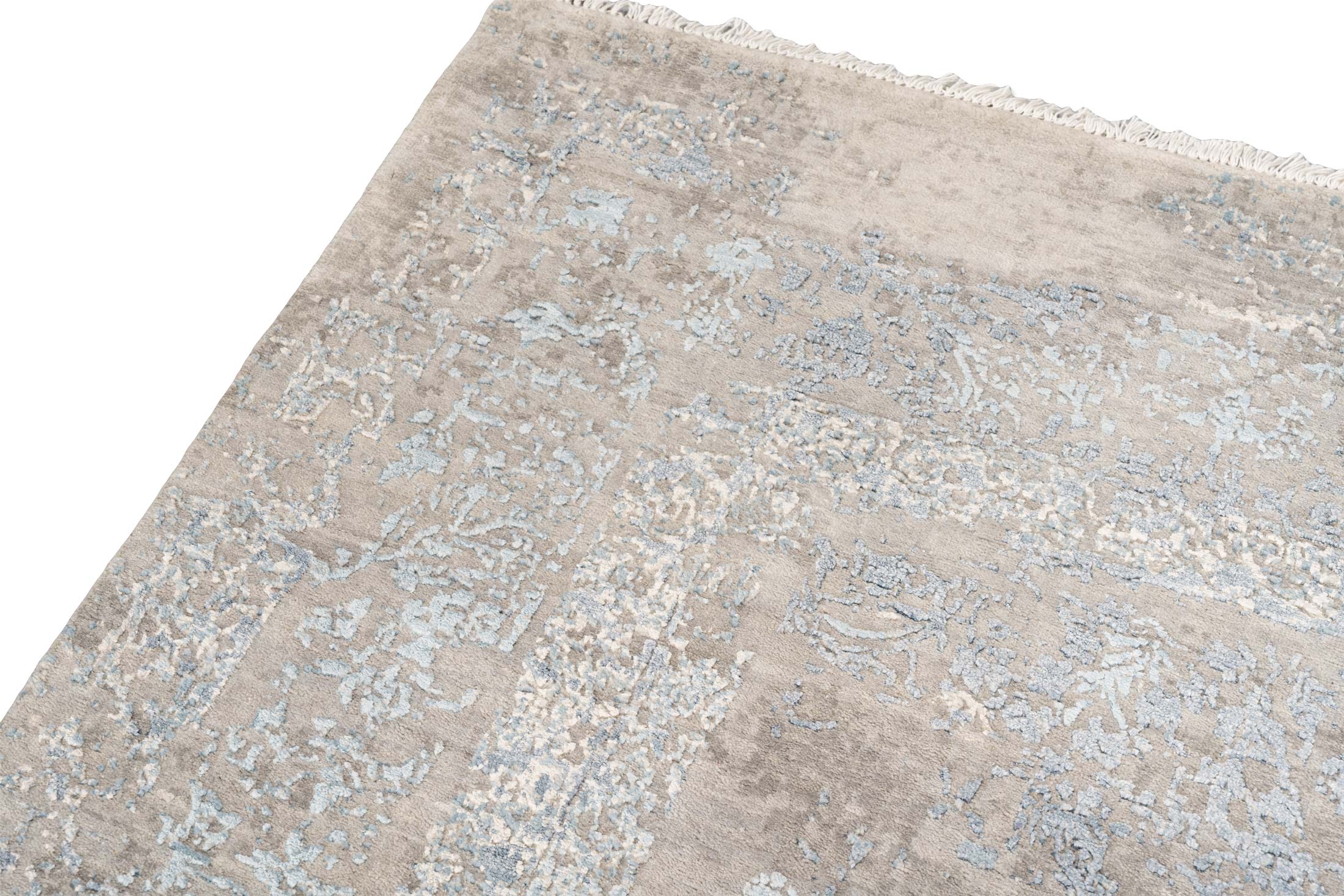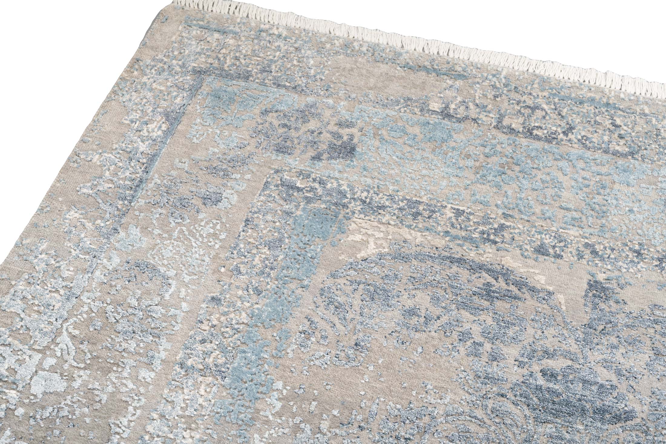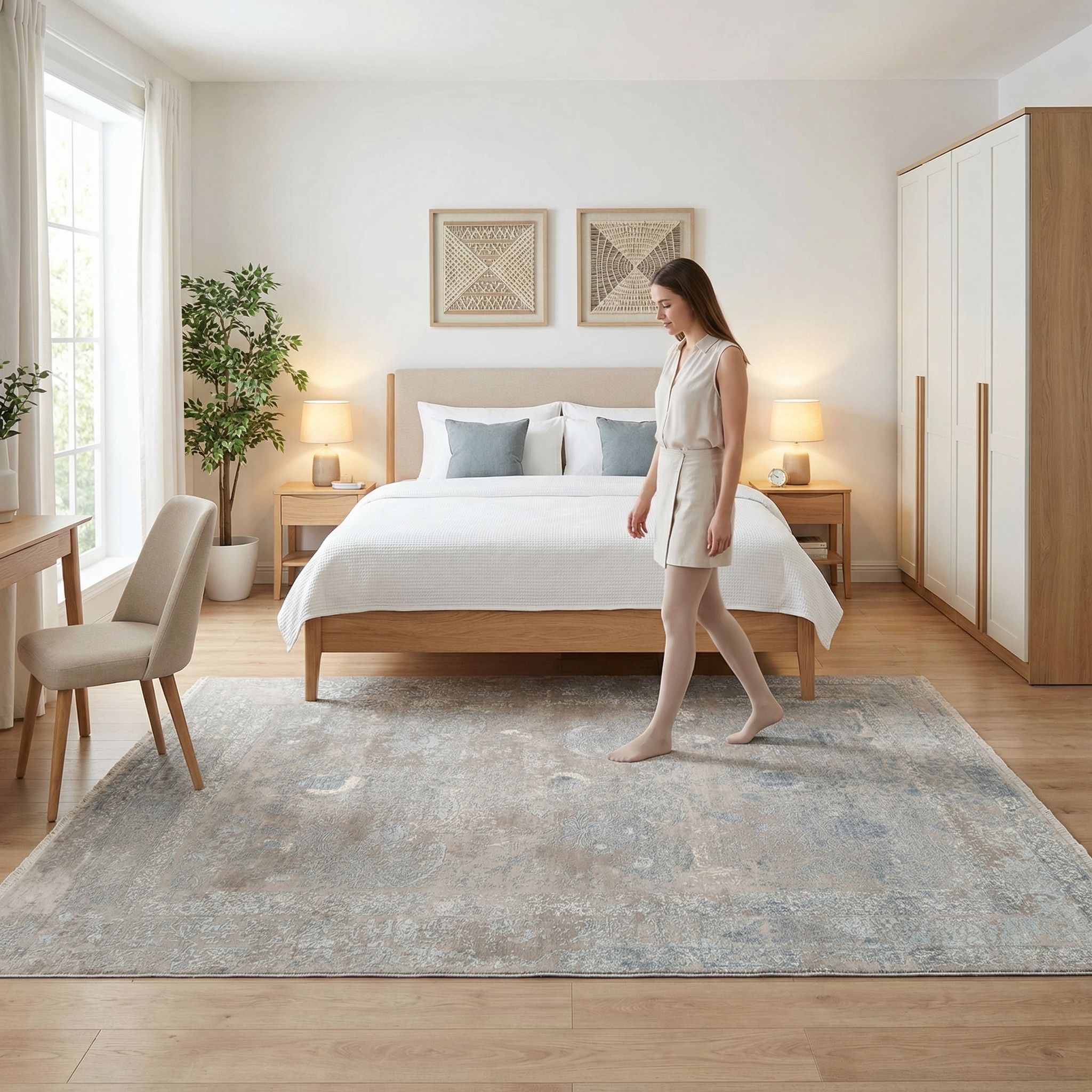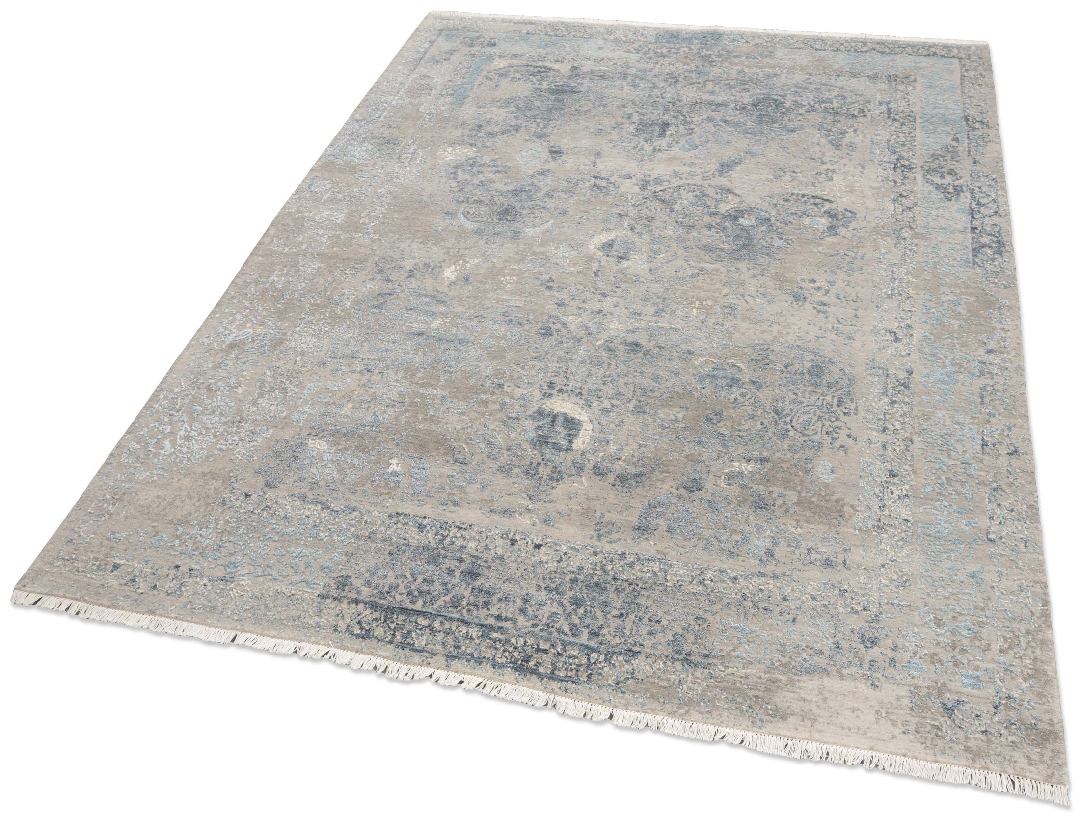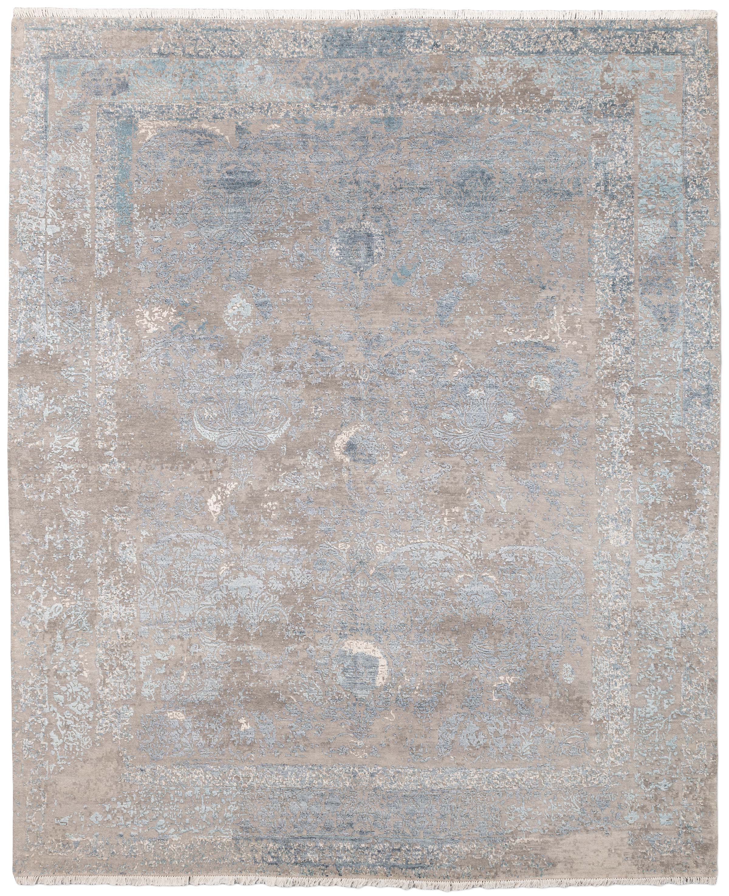 Hier präsentieren wir den handgeknüpften Teppich Eterno aus Indien in einer ruhigen, eleganten Farbwelt. Die Hauptfarbe ist ein warmes Greige zwischen Beige und hellem Taupe, das dem Raum sofort eine natürliche, wohnliche Basis gibt. Dazu kommen als wichtigste Akzentfarben ein kühles Eisblau bis Taubenblau sowie sanfte Silbergrau Nuancen, die wie feiner Abrieb über der Fläche liegen und dem Teppich seinen modernen Vintage Charakter verleihen. Kleine Aufhellungen in Creme und gebrochenem Weiß setzen lichte Highlights und lassen einzelne Partien subtil schimmern. Insgesamt wirkt die Farbgebung bewusst zurückhaltend und harmonisch, ohne bunt zu sein, ideal für moderne Interieurs und ruhige Farbkonzepte.