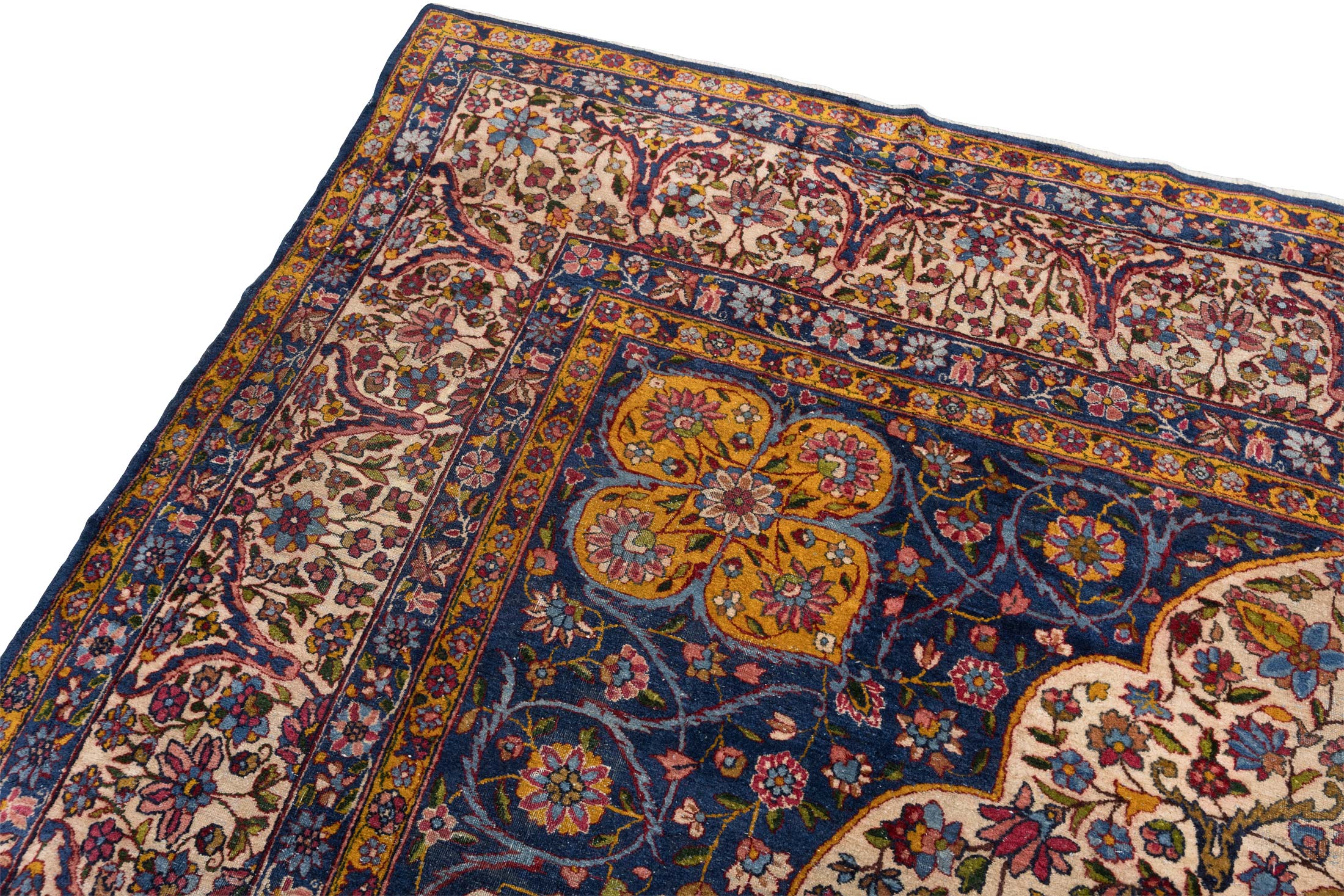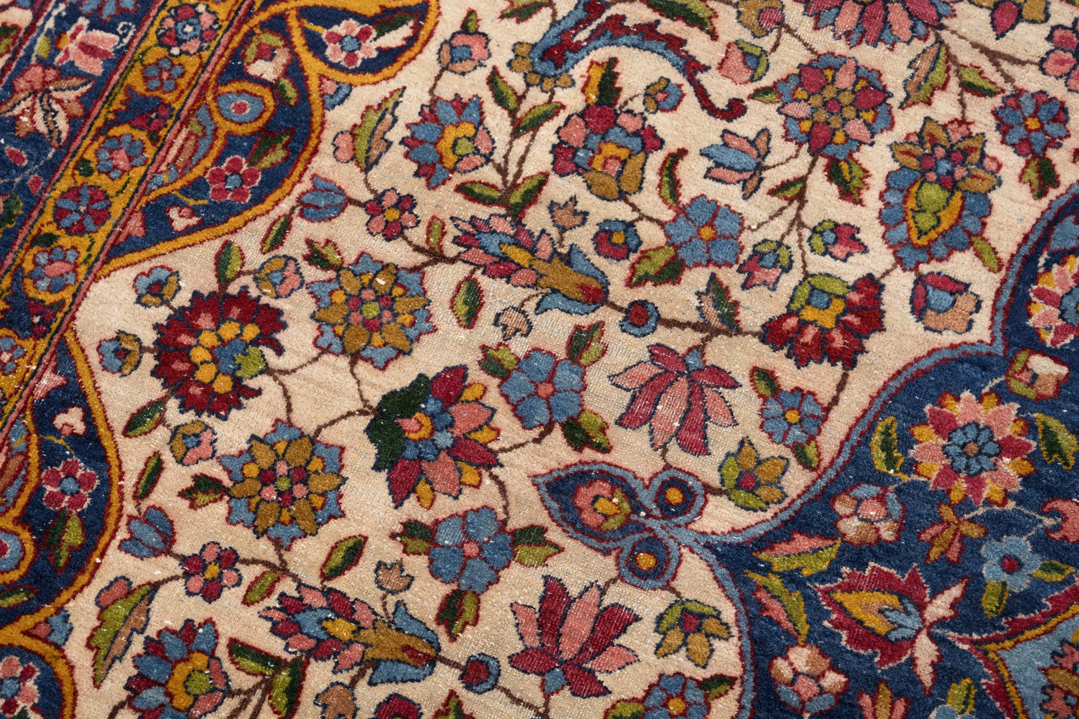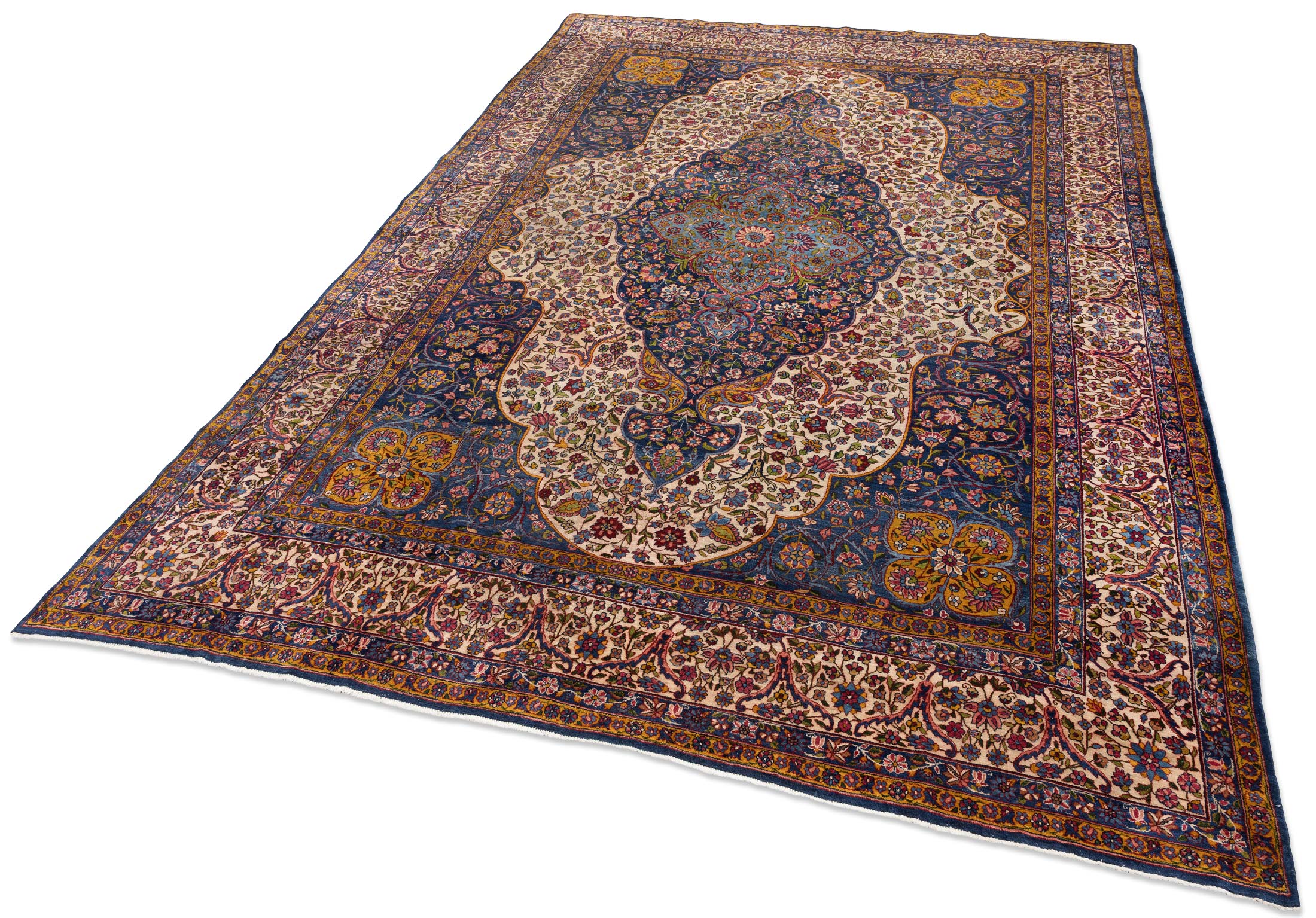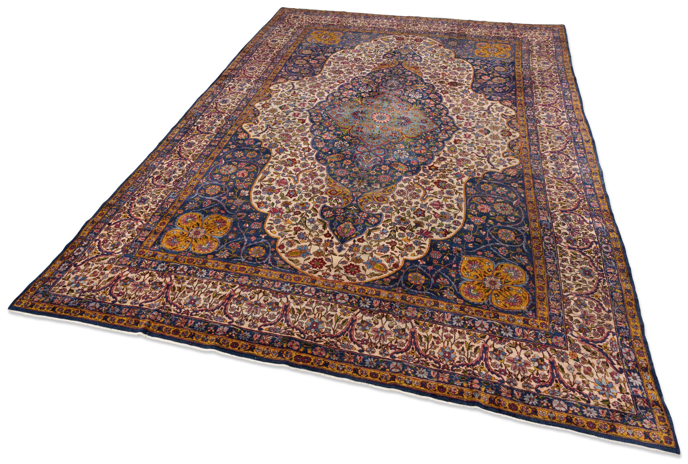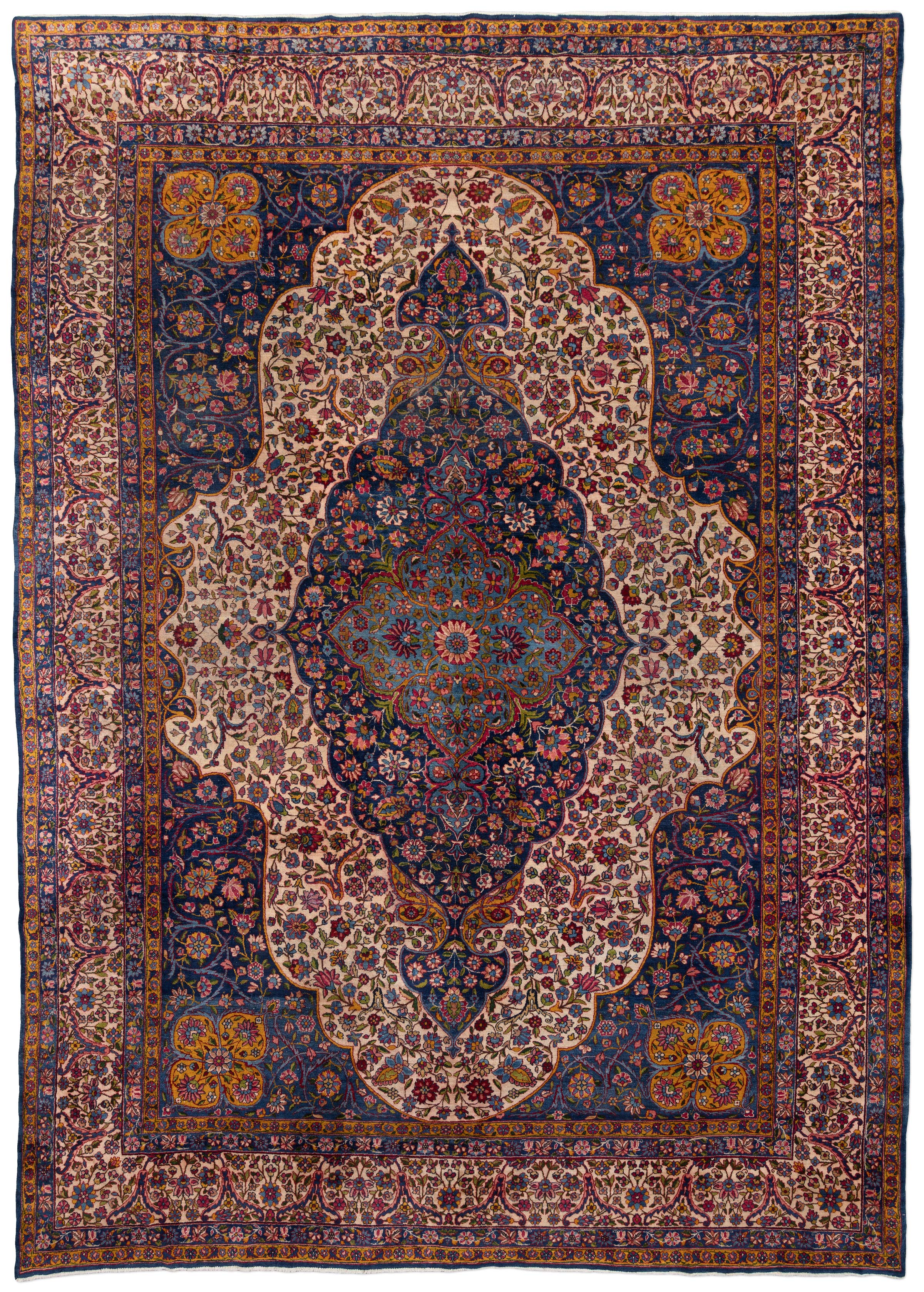 Dieser handgeknüpfte Perser Keschan Mohtasham zeigt als Hauptfarbe ein tiefes, sattes Nachtblau, das dem Teppich eine ruhige, edle Grundstimmung gibt. Dazu tritt ein warmes Elfenbein Creme als großflächiger Gegenpol im Feld, ergänzt von einem leuchtenden Kornblumen bis Mittelblau in der zentralen Medaillonzone. Als vierte Leitfarbe setzen akzentreiche Rotnuancen in Richtung Rubinrot klare Kontraste in Blüten und Konturen. Darüber hinaus wirkt die Farbwelt insgesamt bunt und lebendig, mit vielen fein abgestuften Tönen wie Goldgelb, zartem Grün und weiteren kleinen Farbakzenten, typisch für Pflanzenfarben und die außergewöhnliche Zeichnung dieser Gruppe.