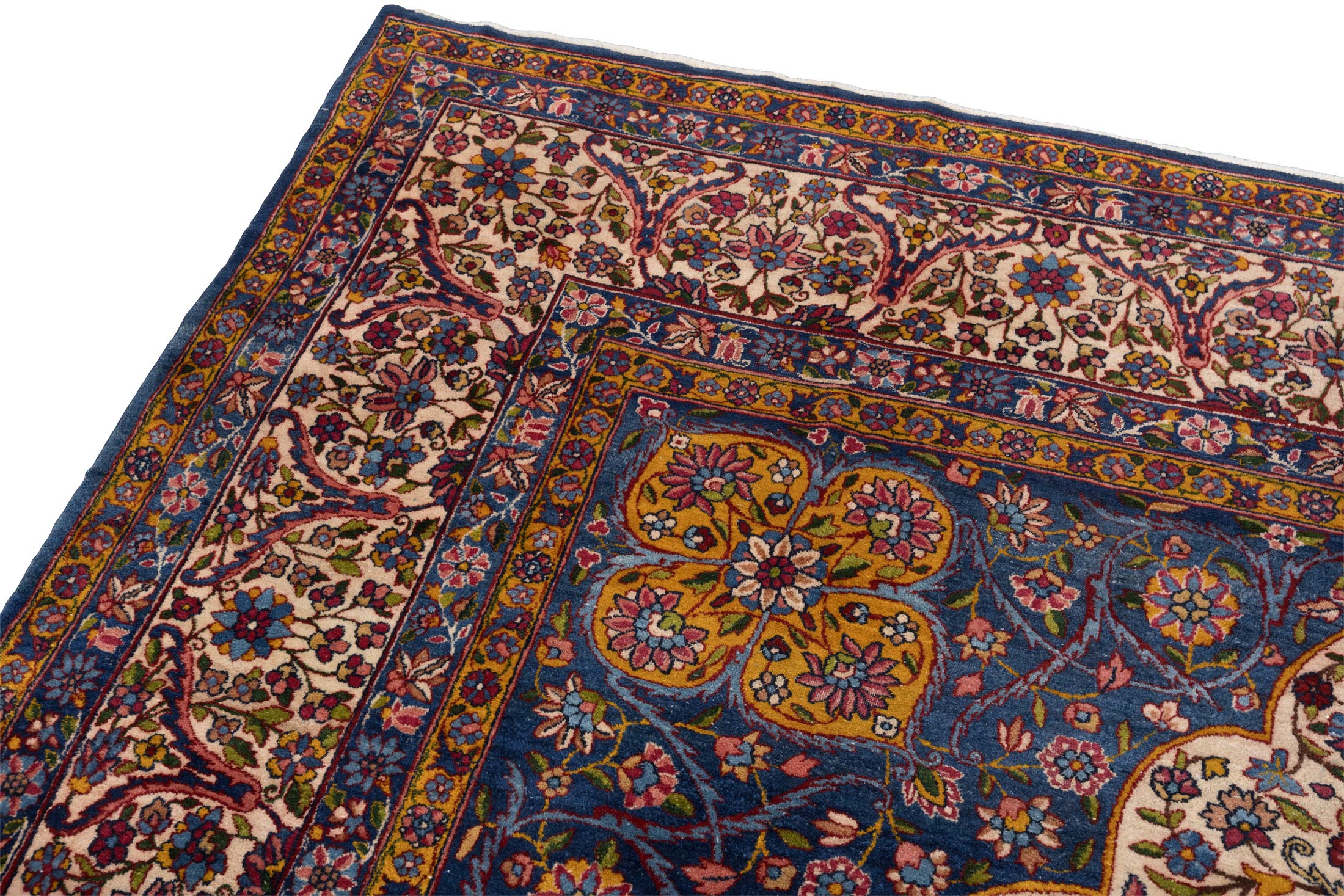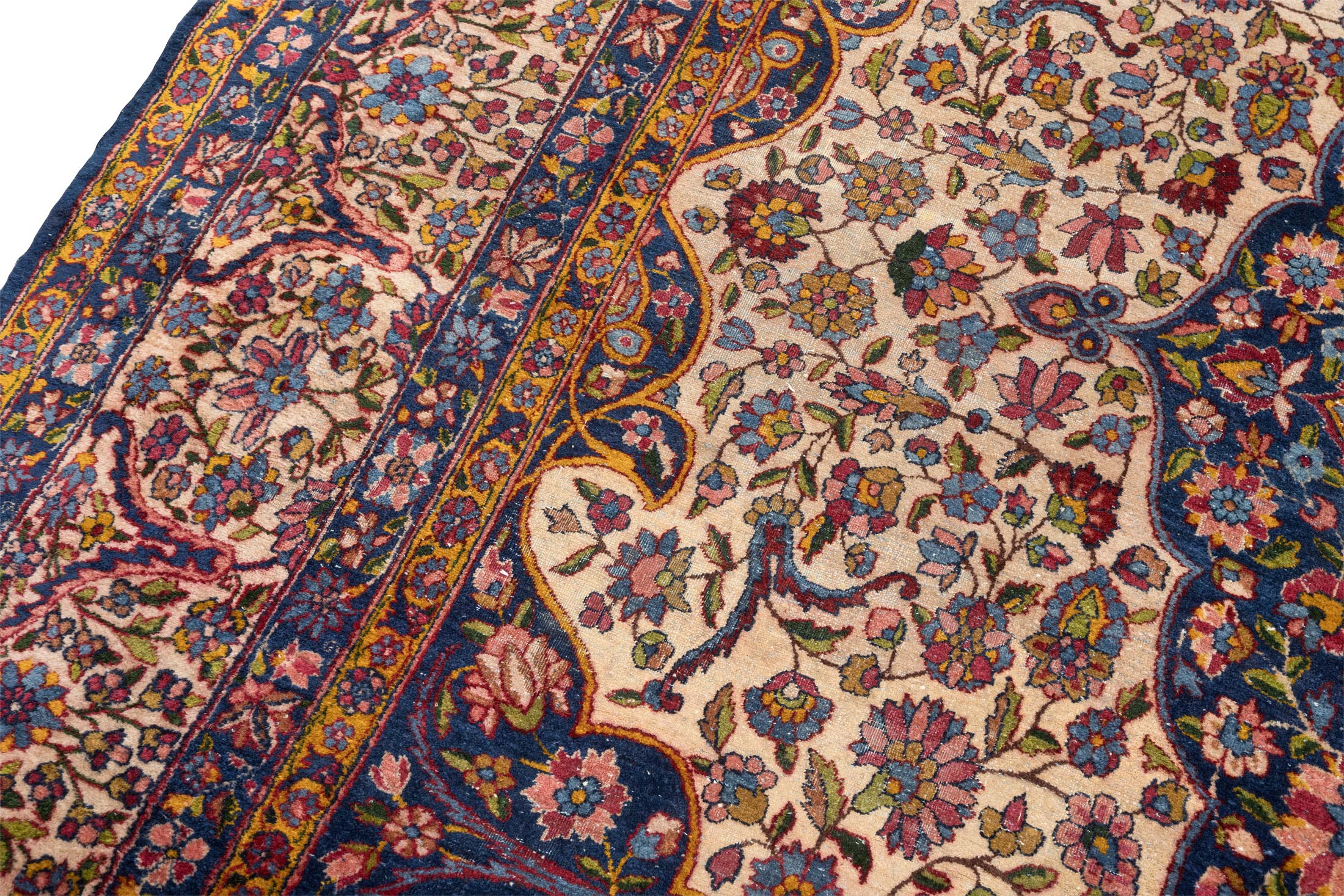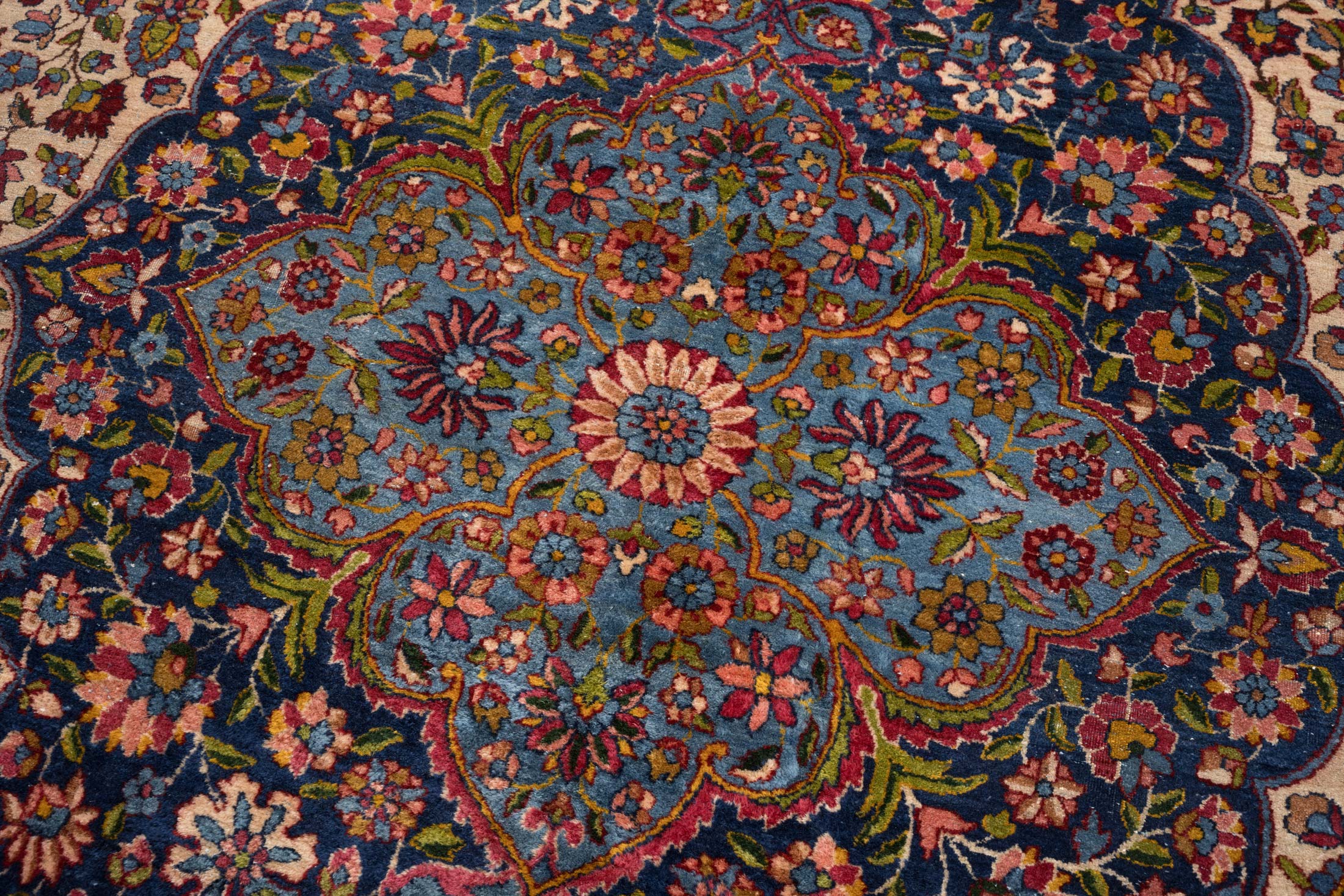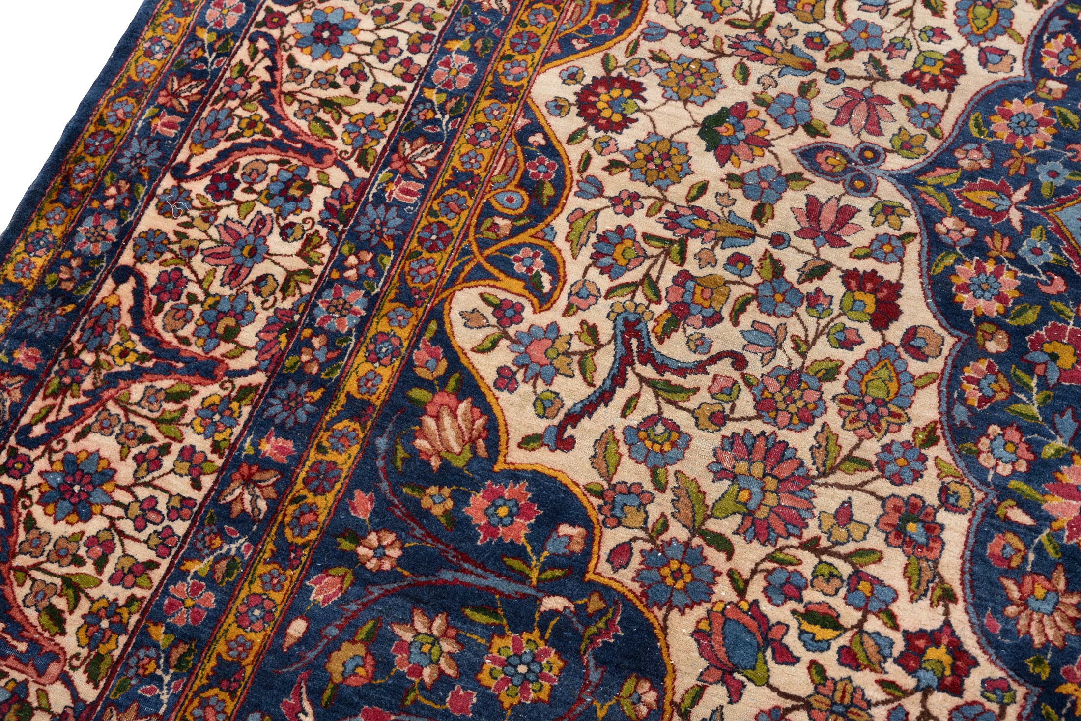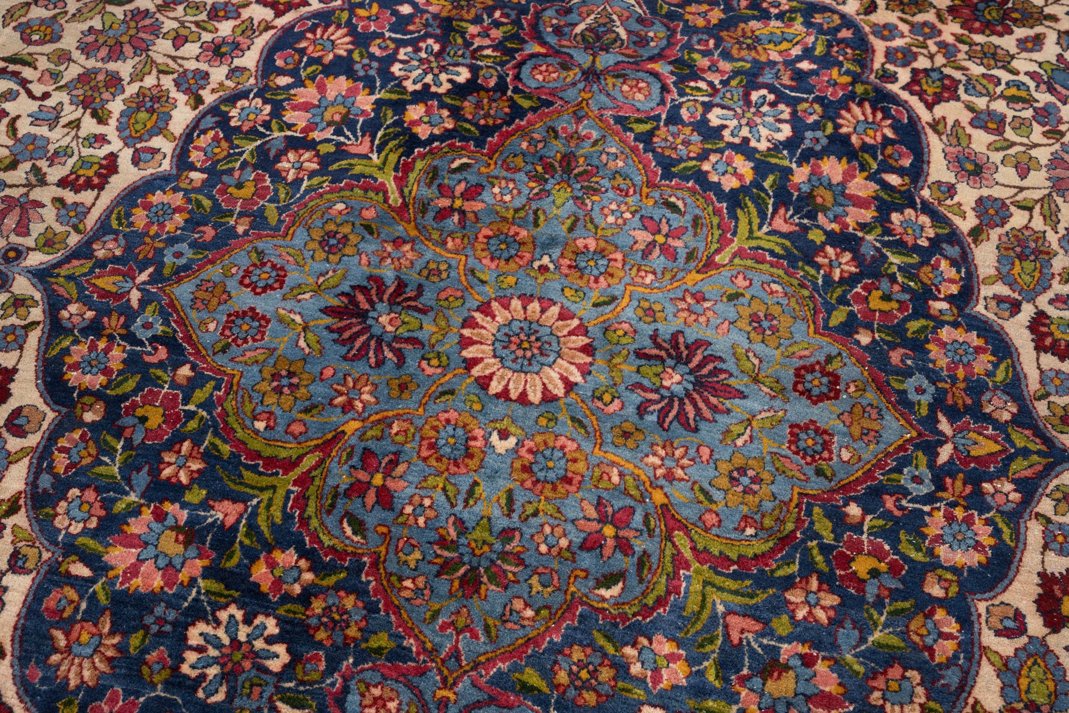 Dieser handgeknüpfte Perser Keschan Mohtasham zeigt als Hauptfarbe ein tiefes, sattes Nachtblau, das dem Teppich eine ruhige, edle Grundstimmung gibt. Dazu tritt ein warmes Elfenbein Creme als großflächiger Gegenpol im Feld, ergänzt von einem leuchtenden Kornblumen bis Mittelblau in der zentralen Medaillonzone. Als vierte Leitfarbe setzen akzentreiche Rotnuancen in Richtung Rubinrot klare Kontraste in Blüten und Konturen. Darüber hinaus wirkt die Farbwelt insgesamt bunt und lebendig, mit vielen fein abgestuften Tönen wie Goldgelb, zartem Grün und weiteren kleinen Farbakzenten, typisch für Pflanzenfarben und die außergewöhnliche Zeichnung dieser Gruppe.