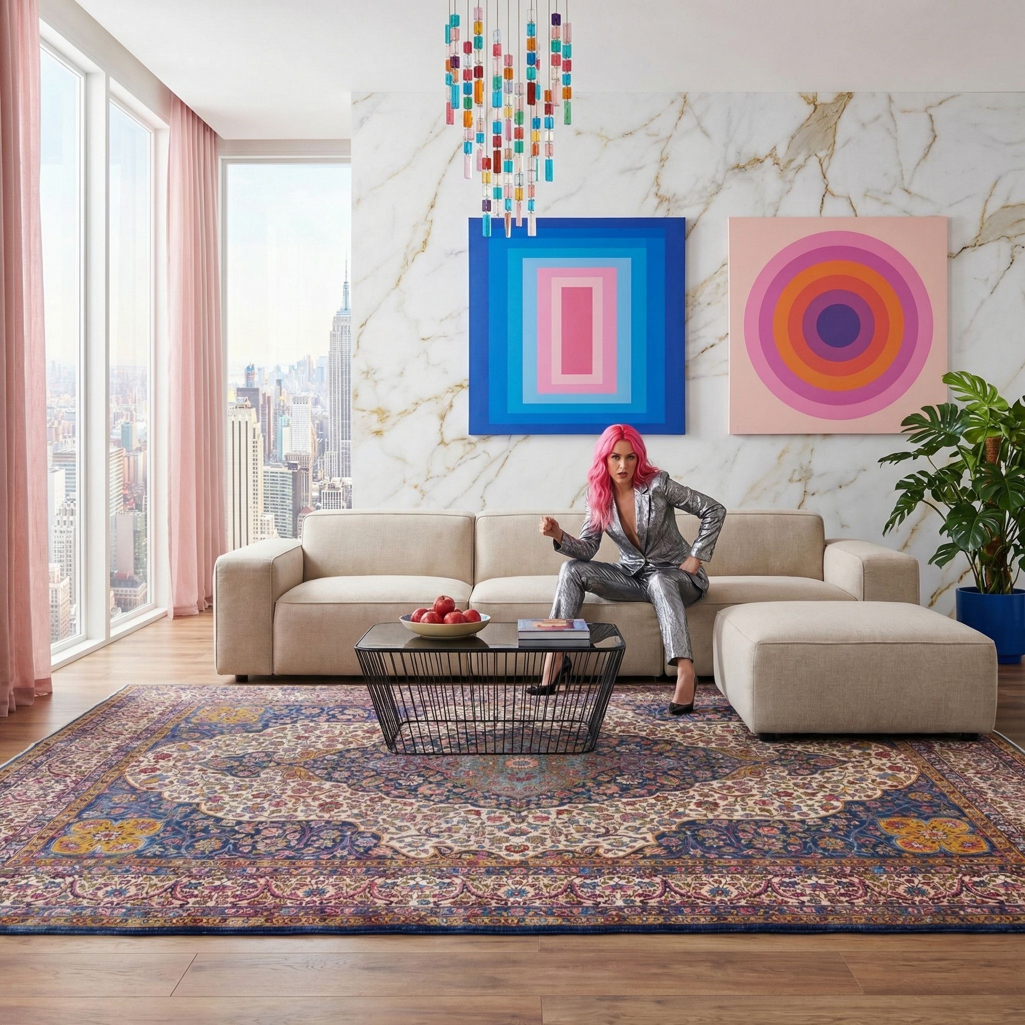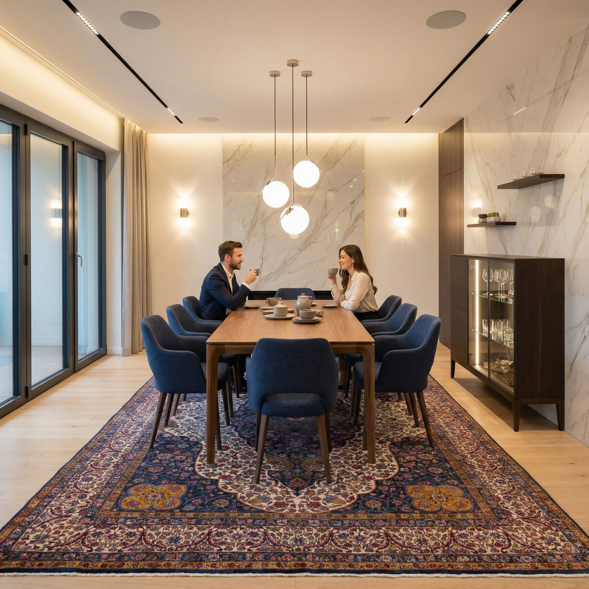 Im Contemporary-Interior funktioniert der Teppich als bewusst gesetzter Stilbruch, der einem klaren, modernen Raum sofort Tiefe und Persönlichkeit gibt. Das große Medaillon und die fein ausgearbeitete Flora wirken wie ein Kunstwerk am Boden – besonders stark zu reduzierten Möbeln und ruhigen Wandfarben. Die leicht abgetragene Oberfläche nimmt dem opulenten Muster Schwere und macht das Gesamtbild eleganter und „curated“. So entsteht ein spannender Mix aus modernem Purismus und historischer Qualität, der Räume hochwertig und individuell wirken lässt.