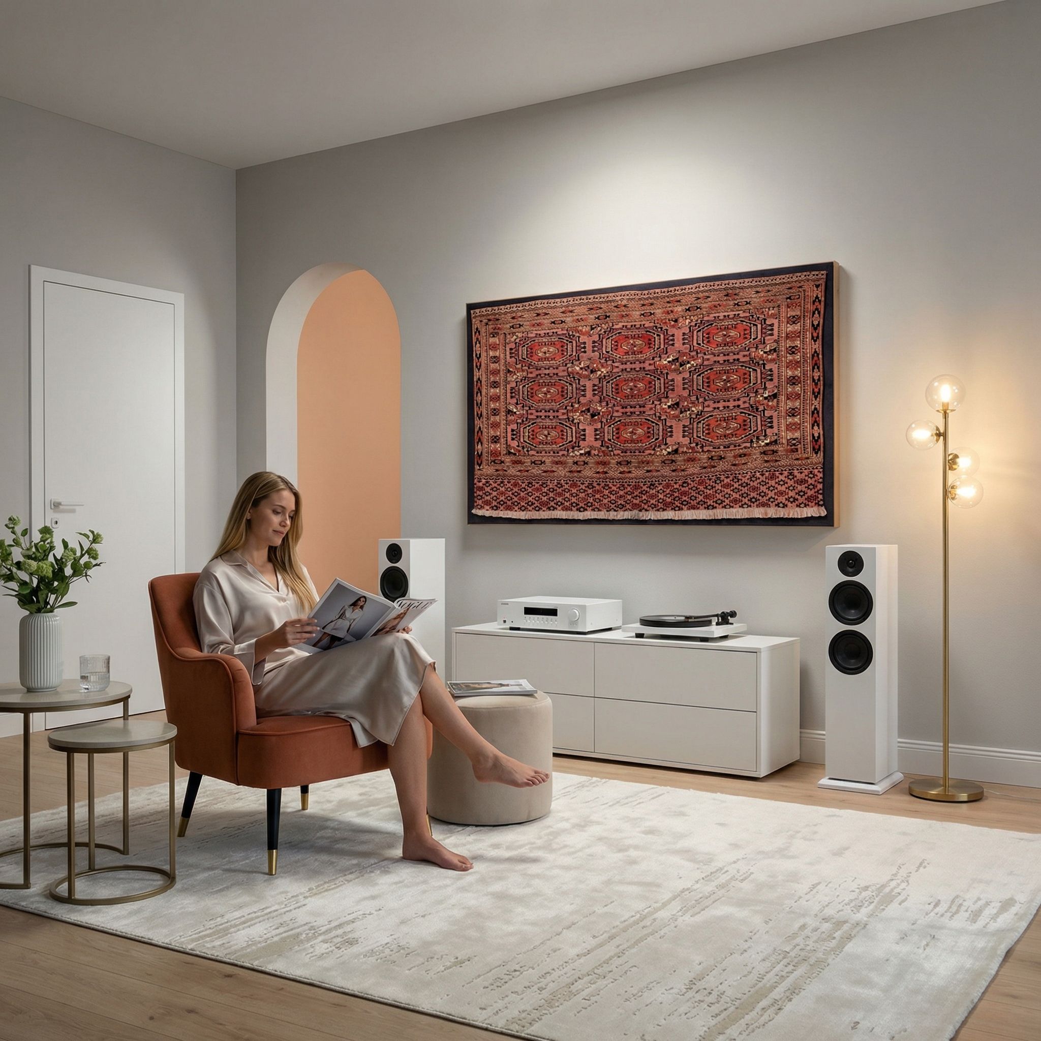 In einem streng reduzierten, zeitgenössischen Ambiente wirkt dieses historische Artefakt als absolut spektakulärer und bewusster Stilbruch. Die komplexe Geometrie und die warme Farbgewalt der Jomuth-Knüpfkunst durchbrechen die Kühle minimalistischer Architektur und glatter Oberflächen aufregend. Es fungiert nicht bloß als Teppich, sondern als kuratiertes Kunstwerk, das einem modernen Raum sofort Tiefe, Geschichte und intellektuellen Anspruch verleiht. Dieser Kontrast zwischen ultramodernem Design und uralter Tradition zeugt von höchstem ästhetischen Selbstbewusstsein.