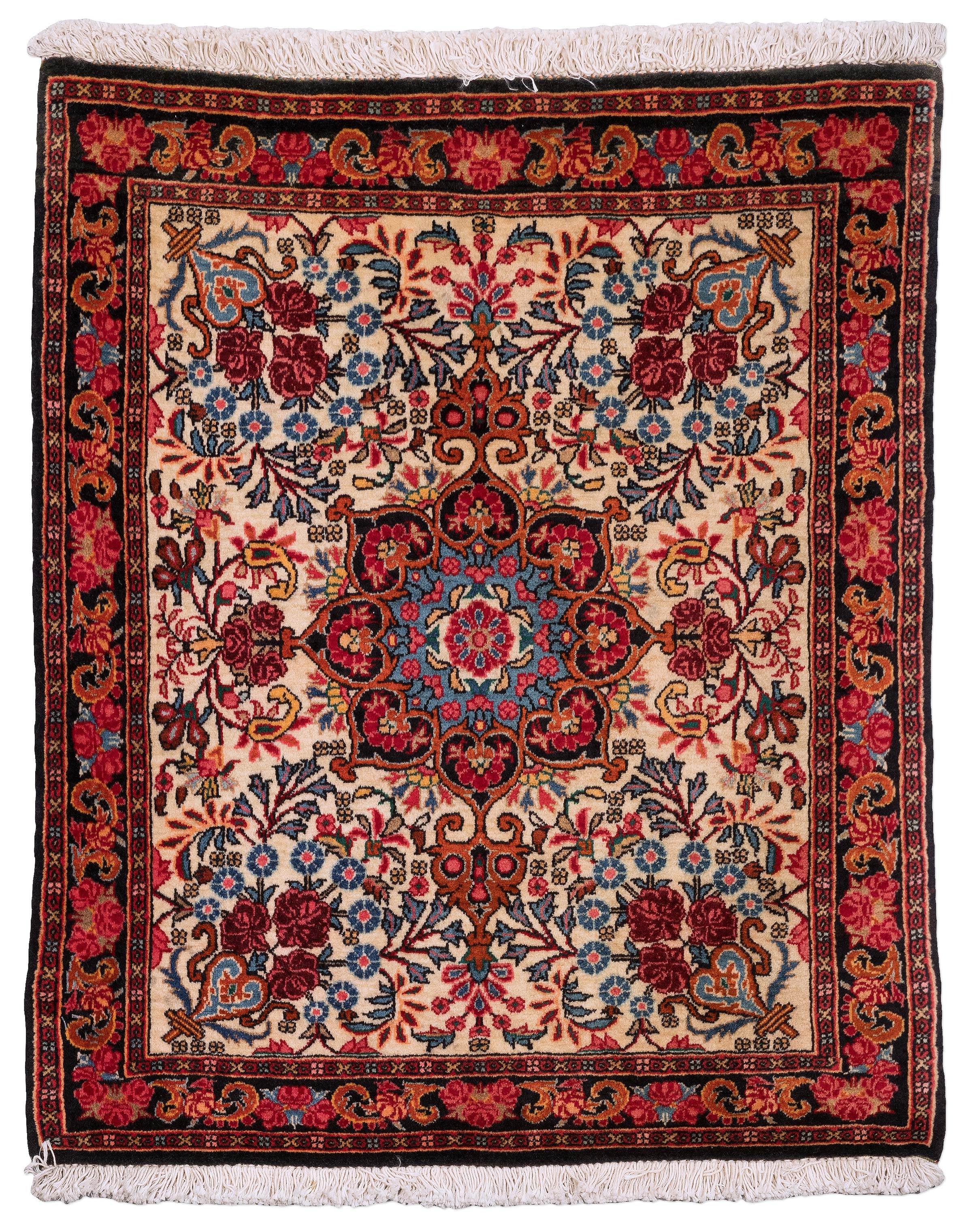 Dieser handgeknüpfte Perser Bidjar zeigt als Hauptfarbe ein warmes Elfenbein Creme im Feld. Dazu treten als wichtigste Akzentfarben ein sattes Rubinrot in den Rosen und in der Bordüre, ein klares Mittel bis Stahlblau im zentralen Medaillon sowie tiefes Schwarzbraun für Konturen und den kräftigen Rahmen. Darüber hinaus wirkt der Teppich angenehm bunt und lebendig, mit kleinen Partien in Ocker Gold, Rostorange und zarten Rosetönen, die das florale Bild abrunden.Das Muster ist ein ...