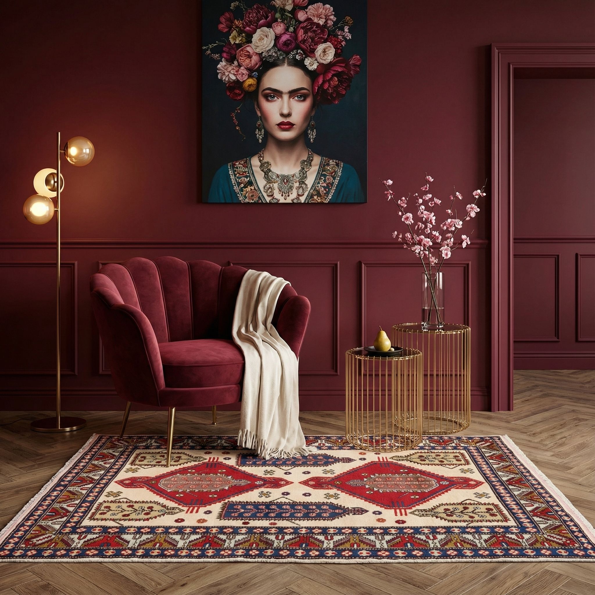 In einem Industrial-Interieur dient dieser farbenfrohe Teppich als warmer, weicher Kontrapunkt zu den typischen kühlen Materialien wie Beton, Stahl und unverputztem Mauerwerk. Die strengen geometrischen Muster des Teppichs passen gut zur geradlinigen Architektur eines Lofts, während die satten Rottöne dem Raum Leben einhauchen. Ein solches Vintage-Stück bricht die Strenge des Fabrik-Chics auf und sorgt für eine wohnliche Insel inmitten der weiten, offenen Flächen. Die Geschichte und "Seele" des alten Teppichs ergänzen den rauen, unperfekten Charme des Industriestils perfekt.