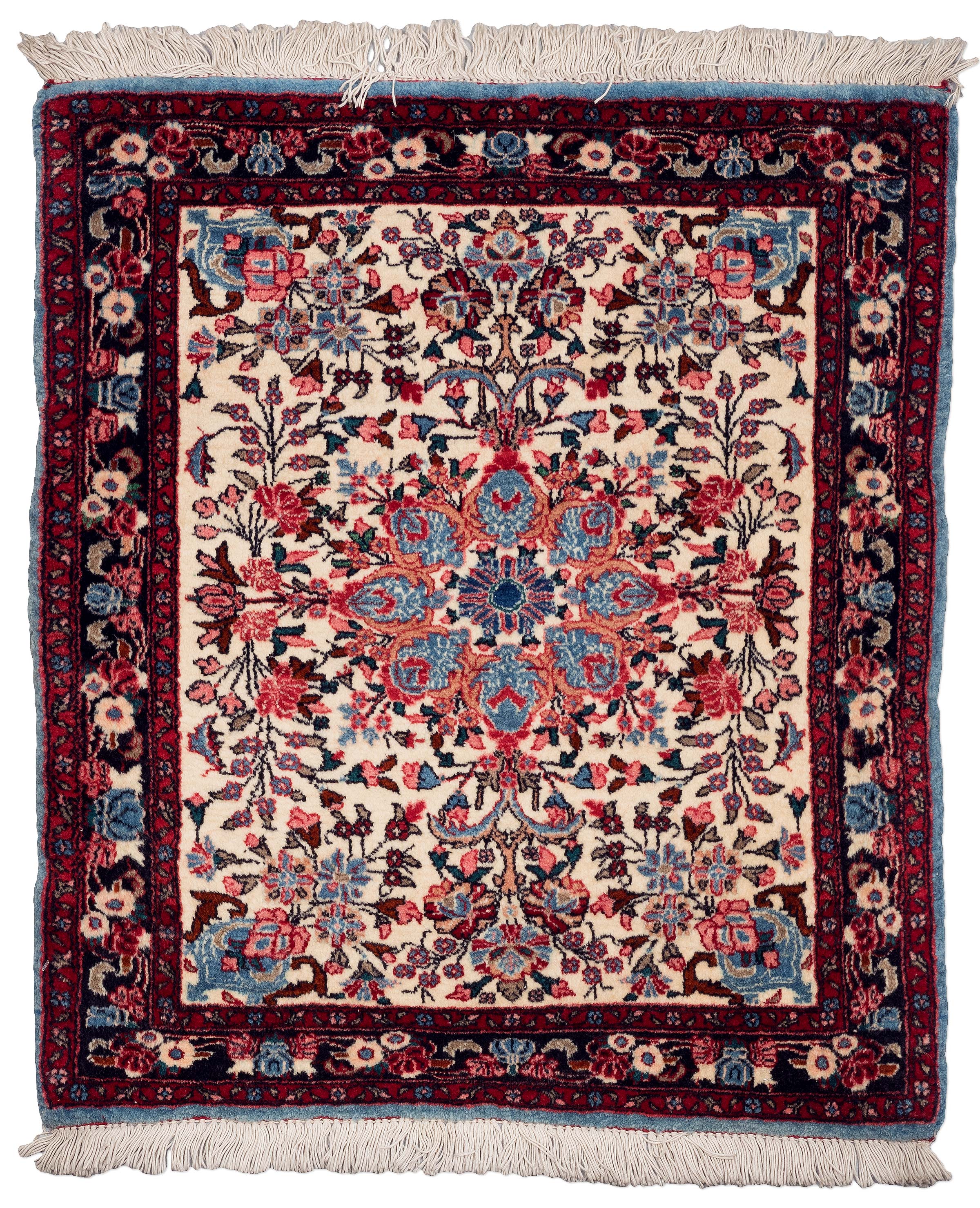 Dieser handgeknüpfte Bidjar-Teppich aus Persien besticht durch seine exquisite Farbpalette und feinste Handwerkskunst. Die Hauptfarbe ist ein elegantes Cremeweiß, das dem Teppich eine helle und freundliche Ausstrahlung verleiht. Diese wird harmonisch durch ein tiefes Bordeauxrot ergänzt, das sowohl im Rand als auch in den floralen Mustern erscheint. Ein kräftiges Himmelblau setzt zusätzliche Akzente und verleiht dem Design Frische und Lebendigkeit. Abgerundet wird die Farbkomposition durch ...mehr Beschreibung