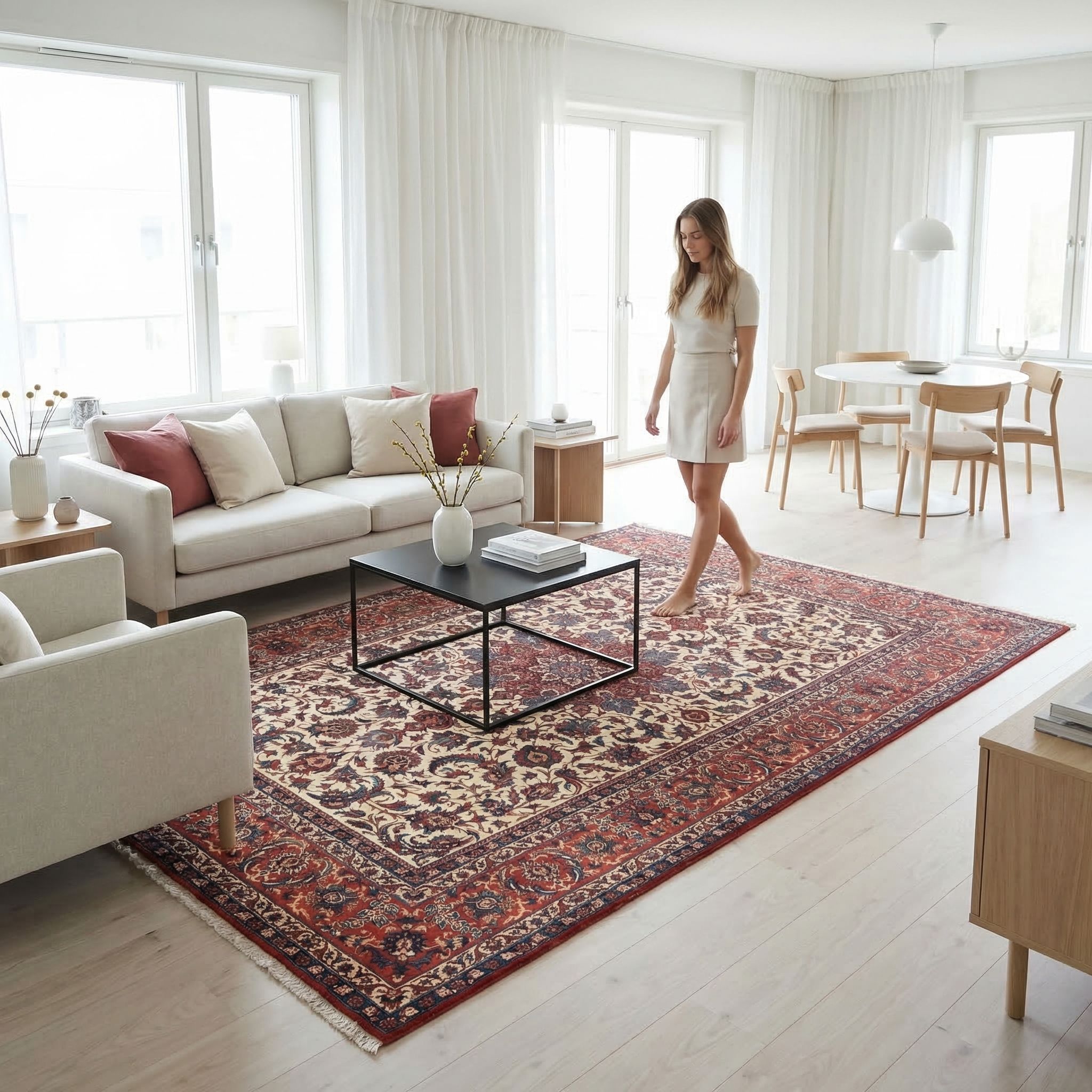 Dieser klassische Teppich passt hervorragend zum New-Country-Style, da er eine Brücke zwischen rustikaler Gemütlichkeit und einer gewissen herrschaftlichen Eleganz schlägt. Das helle, cremefarbene Innenfeld sorgt dafür, dass der Teppich trotz der traditionellen Musterung freundlich genug wirkt, um in das oft hellere, modernisierte Landhaus-Ambiente zu passen. Die floralen Motive greifen das Thema Natur auf, was wunderbar mit Leinenstoffen, Fellen und massiven, hellen Holzmöbeln harmoniert. Er bringt eine gewisse Bodenständigkeit und Tradition in den Raum, die für ein authentisches und wohnliches Country-Gefühl unverzichtbar ist.