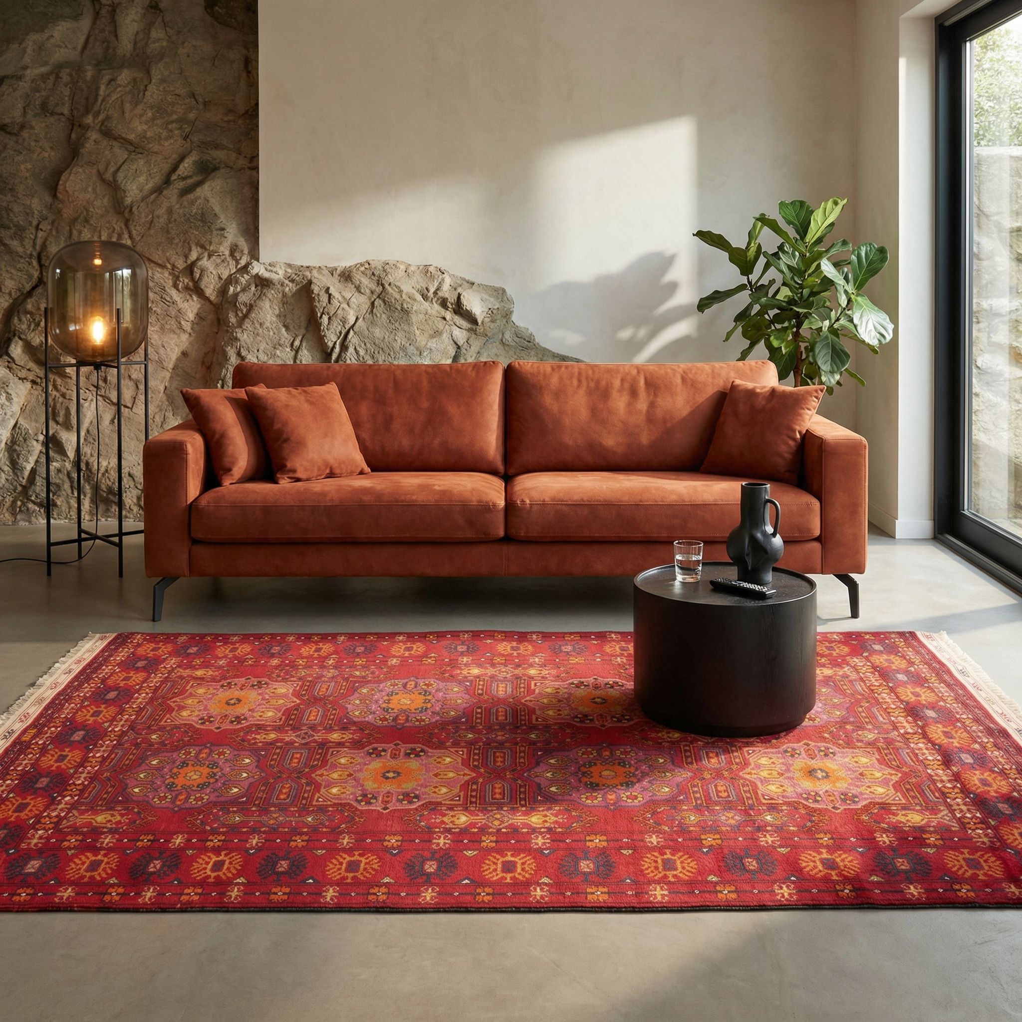 Als gekonnter Stilbruch entfaltet dieser feine Kizelayak in einer kühlen Loft-Umgebung oder einem Raum mit Industrial-Elementen seine volle visuelle Kraft. Die weiche, hochwertige Wolle und das satte Rot stehen in einem spannenden Dialog zu rauem Beton, unverputzten Ziegelwänden und kühlem Metall, wodurch der Raum sofort wohnlicher und einladender wirkt. Die präzise, geometrische Struktur des Teppichs greift die architektonische Klarheit des Industrial-Designs auf, während die traditionelle Handwerkskunst einen notwendigen Hauch von Geschichte und Beständigkeit hinzufügt. Dieser Teppich beweist, dass robustes Design und elegante Wohnlichkeit keine Gegensätze sind, sondern sich in einer maskulinen und zugleich gemütlichen Ästhetik vereinen lassen.