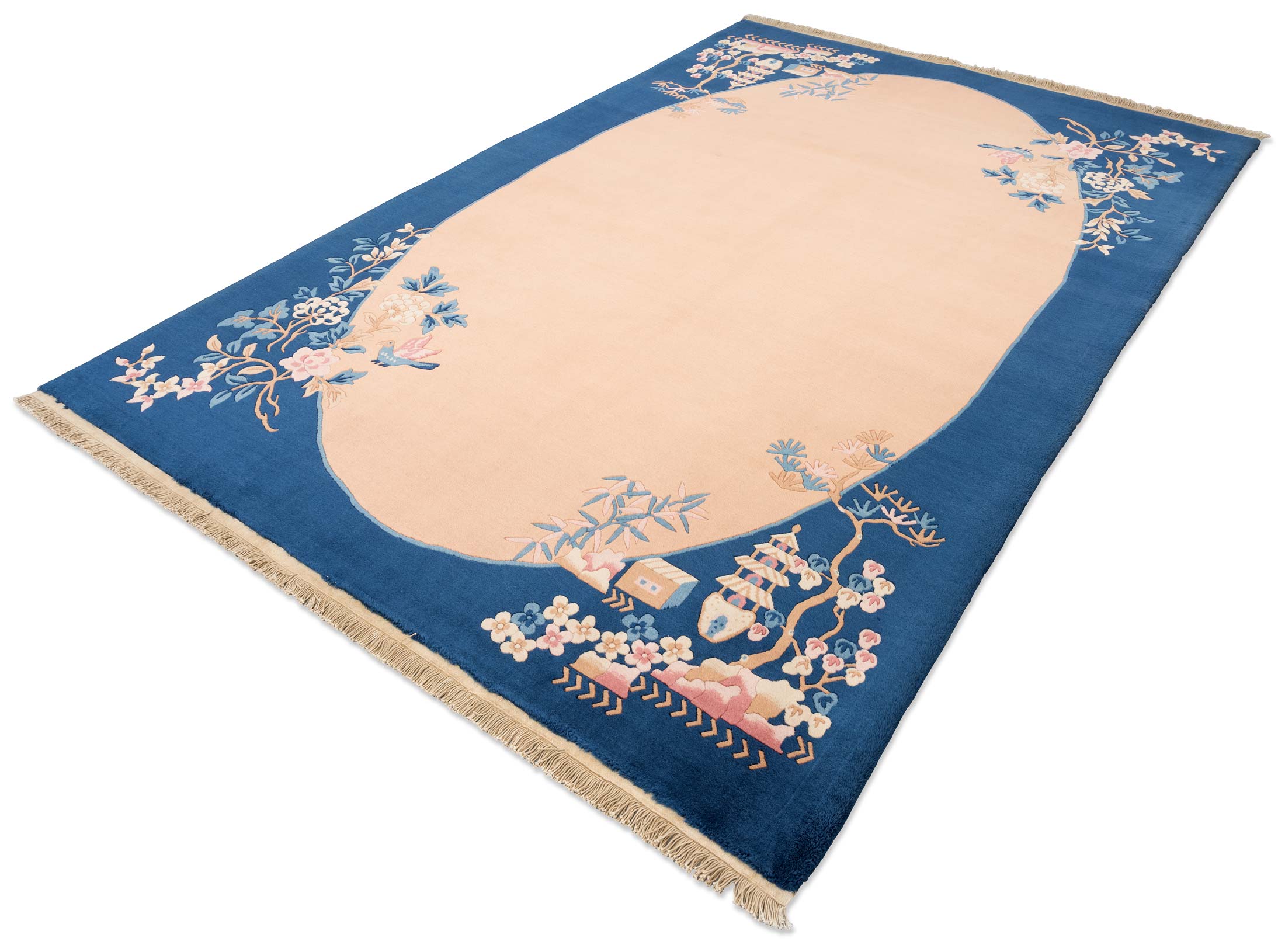 Dieser exquisite handgeknüpfte Peking-Teppich aus China strahlt in seiner Hauptfarbe, einem warmen Beige, das zentralen Raum einnimmt und eine beruhigende Atmosphäre schafft. Eingefasst wird dieses sanfte Beige von einem tiefen, satten Blau, das den Teppich umrahmt und ihm eine majestätische Note verleiht. Die kunstvollen floralen Muster und zarten Verzierungen sind in einem harmonischen Rosa gehalten, das dem Teppich einen fröhlichen und lebendigen Akzent verleiht. Diese meisterhafte Kombination von Farben und Mustern verkörpert die zeitlose Eleganz chinesischer Teppichkunst. Mit einem klassischen, antiken Design und sorgfältigem Reliefschnitt ist dieser Teppich mehr als nur ein Dekorationsstück - er ist ein Ausdruck von Stil und Geschichte. Hergestellt aus natürlichen Materialien, spiegelt er die lange Tradition und das handwerkliche Können wider, das seit dem 17. Jahrhundert gepflegt wird. Erleben Sie ein Stück chinesischer Kunstgeschichte in Ihrem Zuhause mit diesem einzigartigen Teppich.