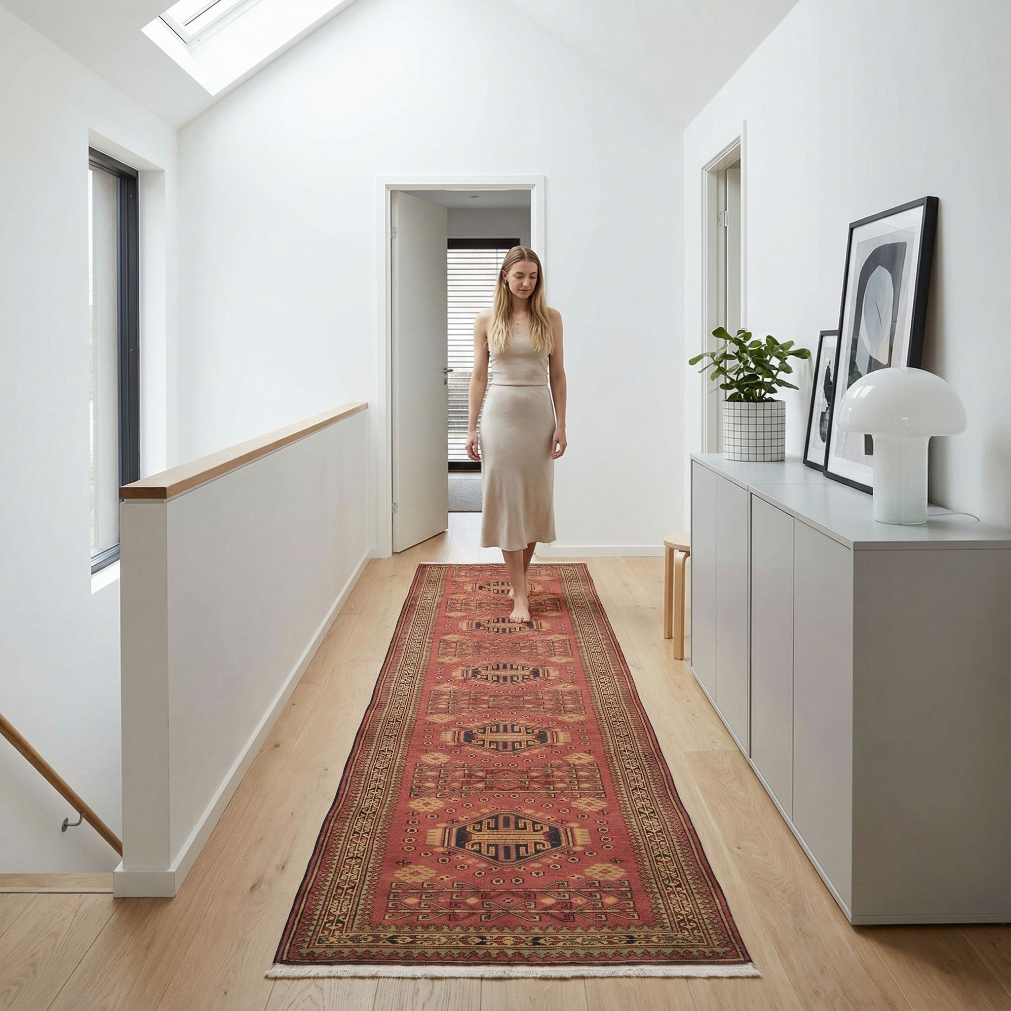 Dieser handgeknüpfte Teppich aus Kuba, Aserbaidschan, besticht durch seine warme Hauptfarbe in einem satten Rostrot. Die harmonische Kombination aus Dunkelblau, Goldgelb und einem dezenten Grün verleiht dem Teppich eine lebendige und zugleich elegante Ausstrahlung. Die geometrischen Muster sind ein charakteristisches Merkmal der Kuba-Teppiche und verleihen ihm eine zeitlose Schönheit. Der Teppich ist um 1960 entstanden und befindet sich in einem unbenutzten, neuwertigen Zustand.Dank der ...