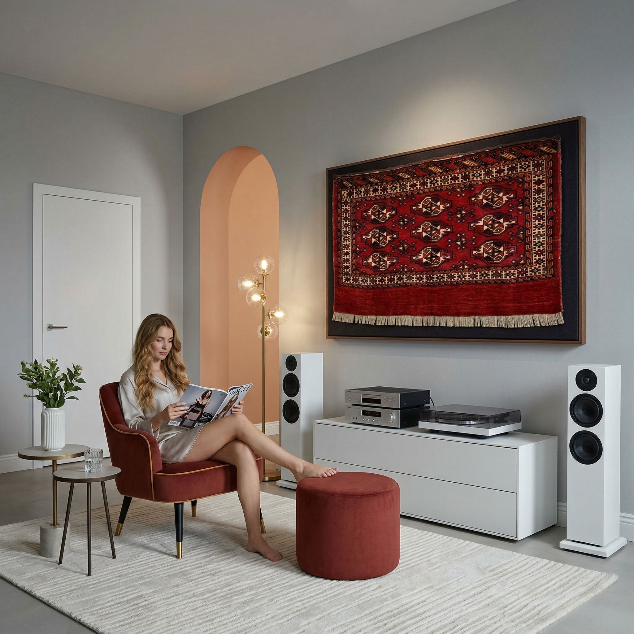 In einem streng reduzierten, zeitgenössischen Ambiente wirkt dieses historische Artefakt als absolut spektakulärer und bewusster Stilbruch. Die komplexe Geometrie und die warme Farbgewalt der Jomuth-Knüpfkunst durchbrechen die Kühle minimalistischer Architektur und glatter Oberflächen aufregend. Es fungiert nicht bloß als Teppich, sondern als kuratiertes Kunstwerk, das einem modernen Raum sofort Tiefe, Geschichte und intellektuellen Anspruch verleiht. Dieser Kontrast zwischen ultramodernem Design und uralter Tradition zeugt von höchstem ästhetischen Selbstbewusstsein.
