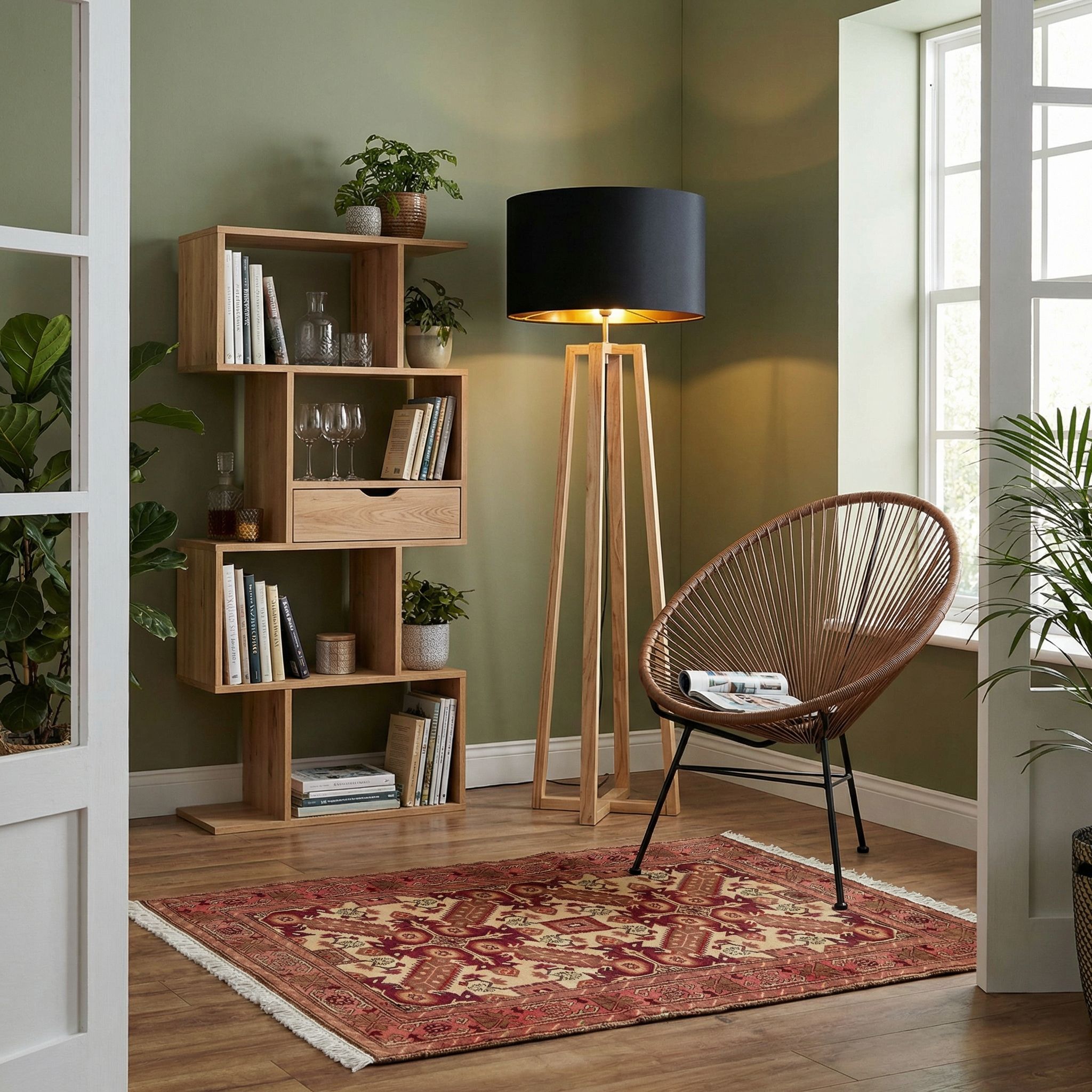 In einem kühlen Industrial-Ambiente fungiert dieser Teppich als gekonnter Stilbruch, der dem Raum sofortige Wärme und wohnliche Tiefe verleiht. Die geometrische Strenge des Andreaskreuz-Motivs korrespondiert hervorragend mit den klaren Linien von Metallregalen und Betonwänden, während die Wolle einen haptischen Kontrast zu Leder und Stahl bildet. Als seltenes Sammlerstück unterstreicht er den Anspruch auf Exklusivität und Qualität, der in hochwertigen Lofts oft gesucht wird. Dieser Teppich bricht die Härte der Industrie-Ästhetik auf und verwandelt eine raue Umgebung in ein einladendes Zuhause mit Geschichte.