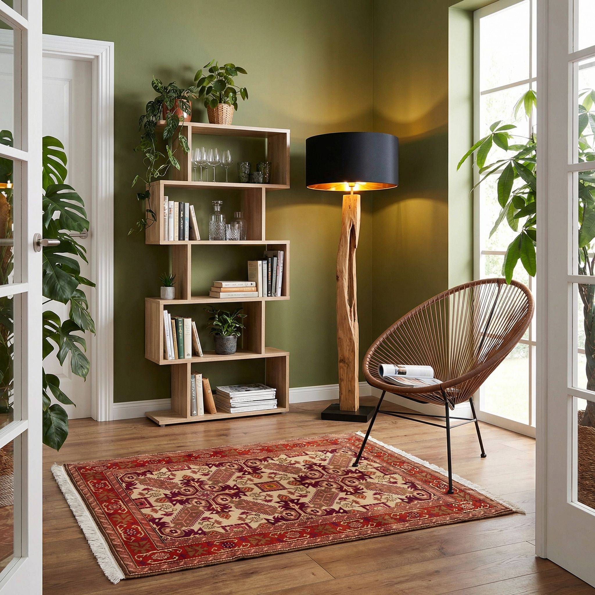 Als gekonnter Kontrapunkt in einem Industrial-Loft sorgt dieser feingeknüpfte Teppich für die dringend benötigte Wohnlichkeit und Wärme zwischen kühlem Beton, Stahl und unverputzten Ziegelwänden. Die geometrische Strenge des Andreaskreuz-Motivs greift die architektonischen Linien des Industriestils auf, während die satten Rottöne einen vitalen Kontrast zur oft monochromatischen Umgebung bilden. Dieses historische Stück Handwerkskunst bricht die Härte des Raumes und fügt eine Ebene von raffinierter Geschichte und haptischer Weichheit hinzu, die den Raum erst wohnbar macht. So wird der Teppich zum luxuriösen Blickfang, der die raue Ästhetik des Industrial-Designs veredelt und ihm einen Hauch von Weltgewandtheit verleiht.