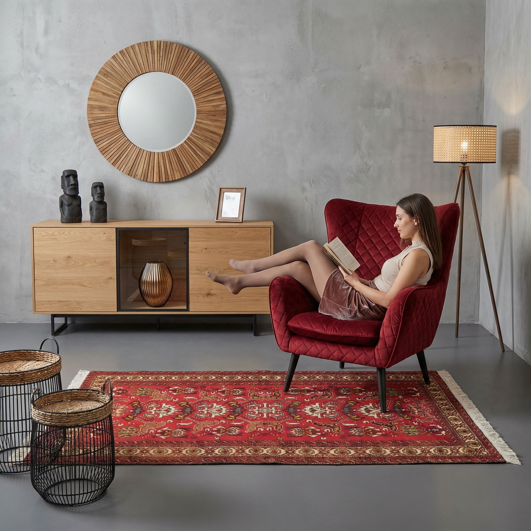 Als bewusster Stilbruch eingesetzt, entfaltet dieser feingeknüpfte Kaukasus-Teppich in einer kühlen Loft-Umgebung eine atemberaubende Wirkung. Die weiche Wolle und die traditionsreiche Geschichte des Teppichs bilden einen spannenden Kontrast zu den harten Materialien des Industrial-Designs wie sichtbarem Beton, Stahl und unverputztem Mauerwerk. Das kräftige Rot bricht die oft monochrome Farbpalette dieses Stils auf und bringt sofortige Wohnlichkeit und Wärme in weitläufige Räume. So wird der Teppich zum exklusiven Blickfang, der die raue Fabrik-Ästhetik mit kultureller Tiefe veredelt.