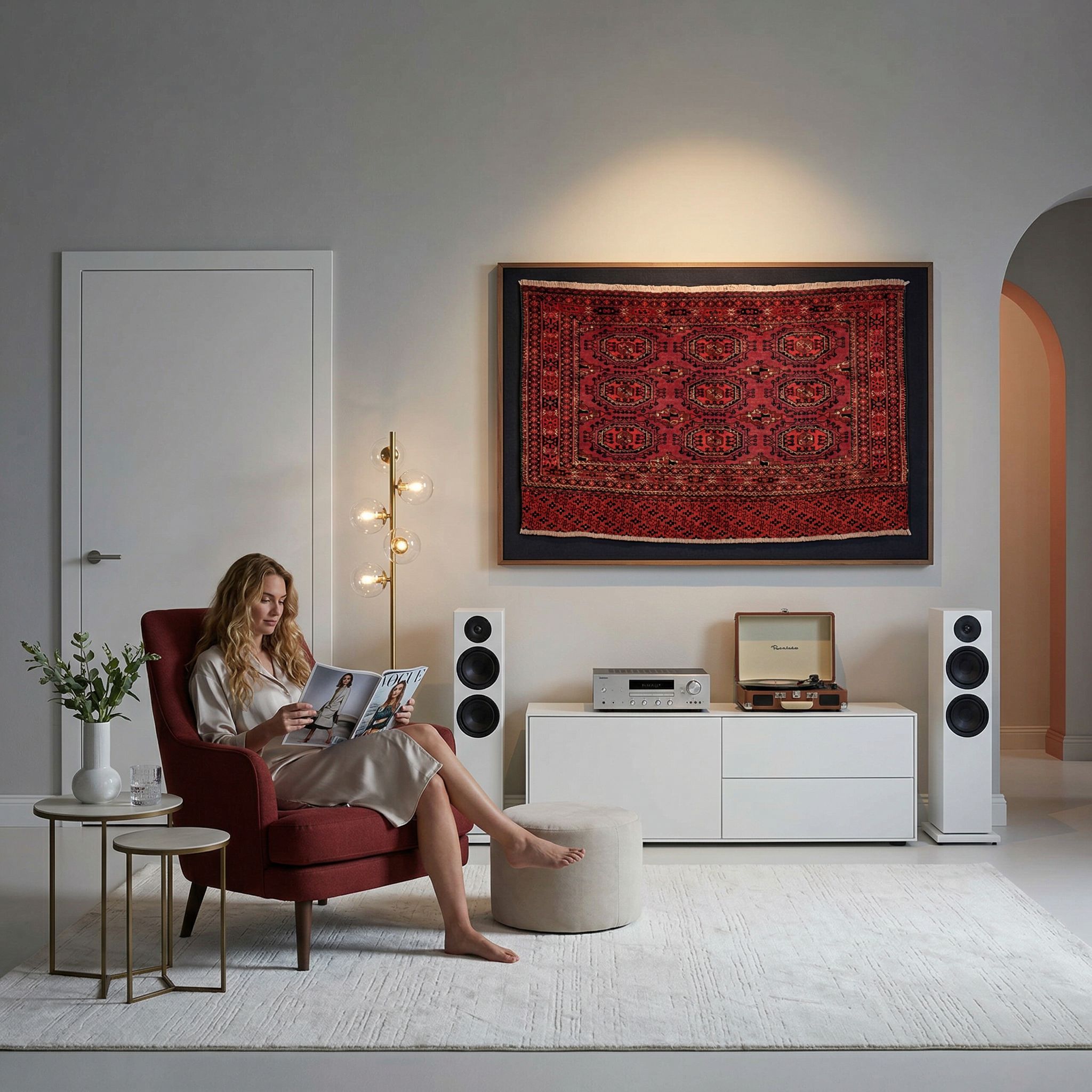 In einem streng reduzierten, zeitgenössischen Ambiente wirkt dieses historische Artefakt als absolut spektakulärer und bewusster Stilbruch. Die komplexe Geometrie und die warme Farbgewalt der Jomuth-Knüpfkunst durchbrechen die Kühle minimalistischer Architektur und glatter Oberflächen aufregend. Es fungiert nicht bloß als Teppich, sondern als kuratiertes Kunstwerk, das einem modernen Raum sofort Tiefe, Geschichte und intellektuellen Anspruch verleiht. Dieser Kontrast zwischen ultramodernem Design und uralter Tradition zeugt von höchstem ästhetischen Selbstbewusstsein.