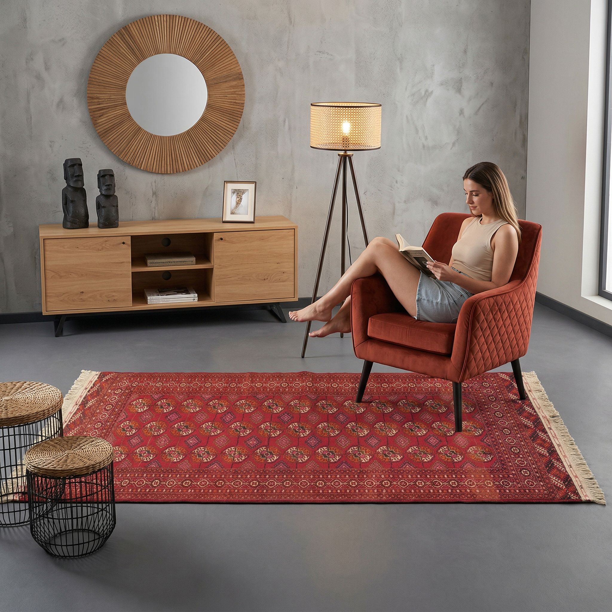 Der New-Country-Style lebt von der Balance zwischen rustikalem Charme und moderner Eleganz, eine Anforderung, die dieser fein geknüpfte Tekke-Teppich perfekt erfüllt. Seine warmen, erdigen Rotnuancen harmonieren hervorragend mit natürlichen Holzdielen und hellen Leinenstoffen und unterstreichen ein Gefühl von geerdeter Sicherheit und ländlichem Luxus. Das klassische Muster verleiht dem Raum eine Würde, die an gehobene Gutshäuser erinnert, wirkt dank des neuwertigen Zustands jedoch frisch und keinesfalls altbacken. Dieses Stück verbindet die Sehnsucht nach Natur und Tradition mit dem Anspruch an hochwertige, langlebige Wohnaccessoires.