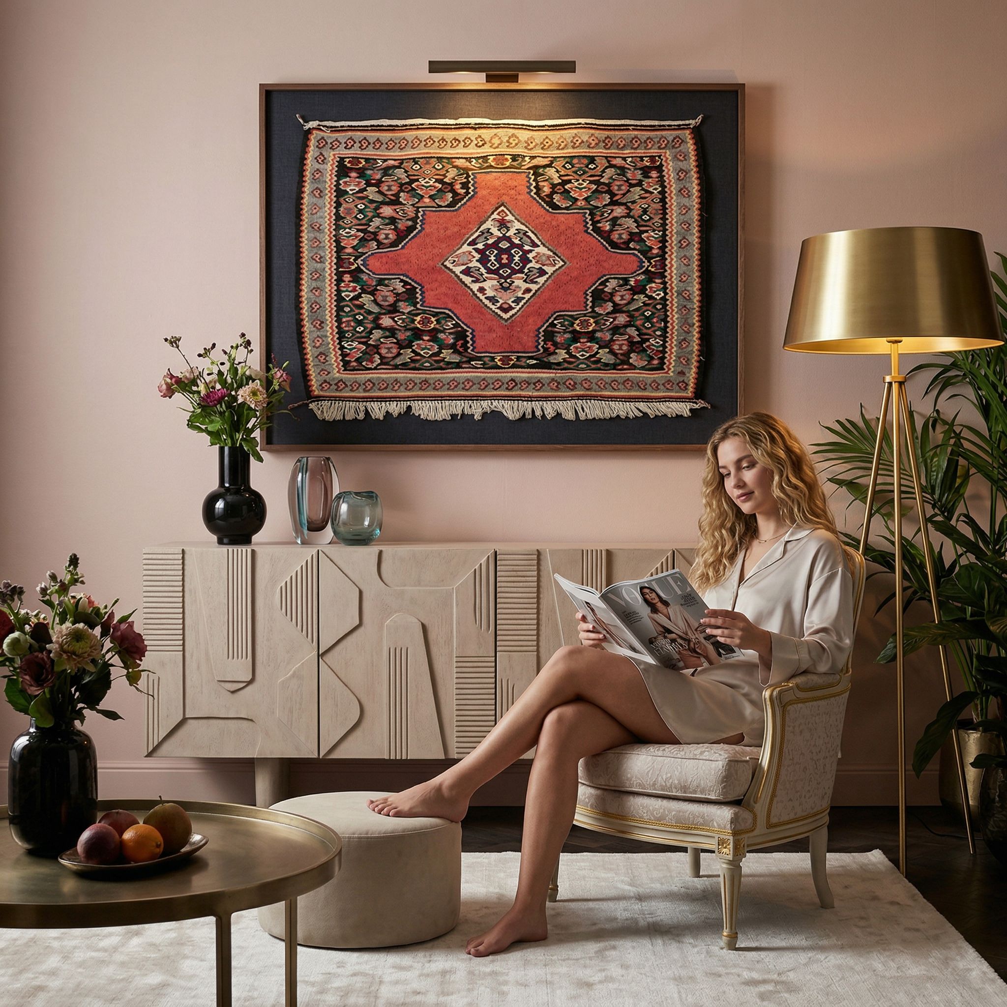 Der Boho-Style lebt von einem unkonventionellen, kreativen Mix, wofür dieser farbenfrohe Kelim mit seinem lebendigen Rot und den kontrastreichen Ornamenten die perfekte Basis bildet. Sein Vintage-Charakter aus den 1950er Jahren verleiht dem Raum die notwendige Seele und die entspannte "Laissez-faire"-Attitüde, die diesen Wohnstil ausmacht. Die Kombination aus handgewebter Wolle und verspielten Motiven harmoniert wunderbar mit Rattanmöbeln, vielen Grünpflanzen, Makramee und weichen Kissenlandschaften. Da der Teppich ein Unikat ist, unterstreicht er zudem die im Bohemian-Interieur so wichtige Wertschätzung für das Individuelle und das Unperfekte.