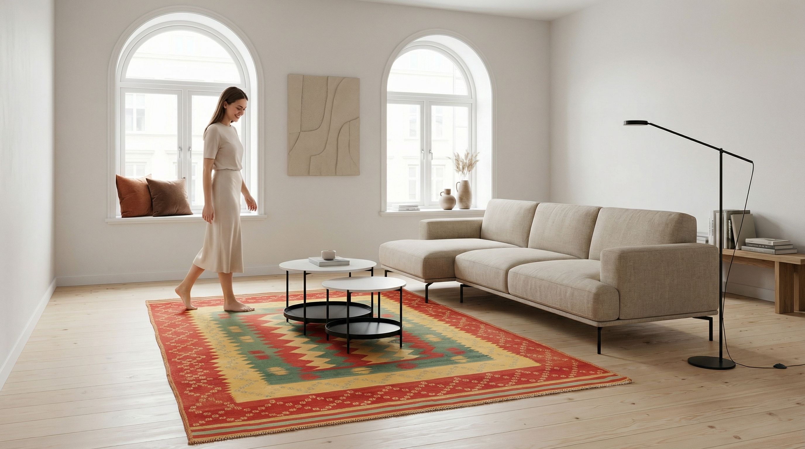 Handgewebte Kelims werden auf einem Webstuhl hergestellt, welcher zuerst aus horizontalen aufgespannten Fäden (der Kette) besteht. Die Kette kann aus Baumwolle oder Schafwolle oder in seltenen Fällen aus Seide bestehen. Durch die Kette wird dann vertikal (der Schuss) ab wechselnd oberhalb und unterhalb der Kette durchgezogen. Der Webvorgang ist relativ einfach, aber er erfordert Geschick und Erfahrung, um ein gleichmäßiges und kunstvolles Bildmuster zu erzeugen. Die Qualität und ...mehr Infos zur Handarbeit