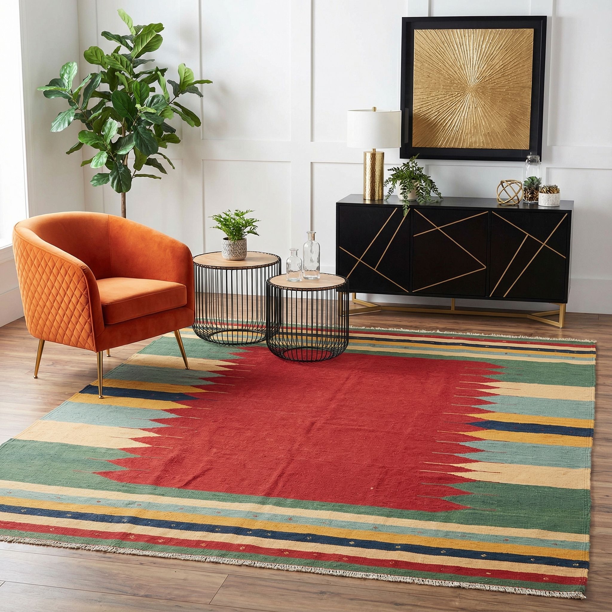 Hier präsentieren wir Ihnen einen einzigartigen handgewebten Afschar-Kamo Kelim aus Persien, der mit seiner intensiven, tiefen Rotnuance als Hauptfarbe besticht. Diese warme Hauptfarbe wird harmonisch ergänzt durch ein lebhaftes Grün, ein sattes Blau und ein sanftes Gelb. Die Farben wirken natürlich und lebendig, da sie aus hochwertigen Pflanzenfarben gewonnen wurden. Die Muster sind schlicht und doch beeindruckend, mit geometrischen Formen, die dem Teppich eine zeitgemäße und doch ...mehr Beschreibung