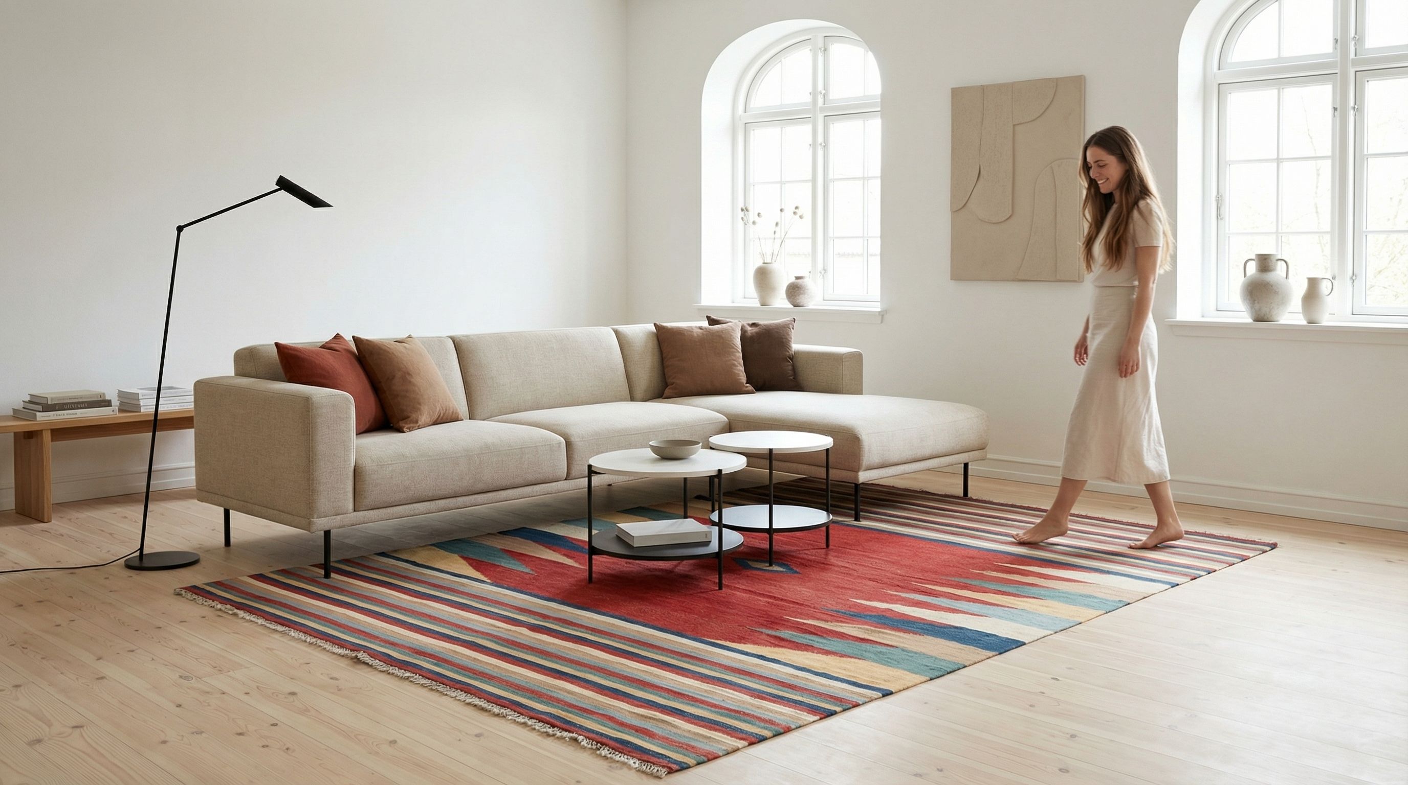 Handgewebte Kelims werden auf einem Webstuhl hergestellt, welcher zuerst aus horizontalen aufgespannten Fäden (der Kette) besteht. Die Kette kann aus Baumwolle oder Schafwolle oder in seltenen Fällen aus Seide bestehen. Durch die Kette wird dann vertikal (der Schuss) ab wechselnd oberhalb und unterhalb der Kette durchgezogen. Der Webvorgang ist relativ einfach, aber er erfordert Geschick und Erfahrung, um ein gleichmäßiges und kunstvolles Bildmuster zu erzeugen. Die Qualität und ...mehr Infos zur Handarbeit