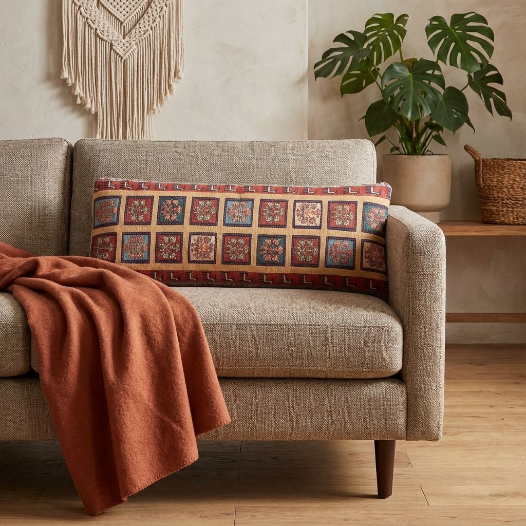 Hier präsentieren wir ein exquisit gestaltetes Afschar-Tabii-Kissen, das die reiche persische Handwerkskunst verkörpert. Die Hauptfarbe dieses Zierkissens ist ein warmes Beige, das die lebendigen Muster und Ornamente wunderbar zur Geltung bringt. Begleitet wird es von einem kräftigen Rostrot und einem tiefen Blau, die zusammen eine harmonische Farbkomposition bilden. Dezente Akzente in Cremeweiß und ein fröhliches Spektrum an Naturtönen vervollständigen das Farbspiel. Die geometrischen ...mehr Beschreibung