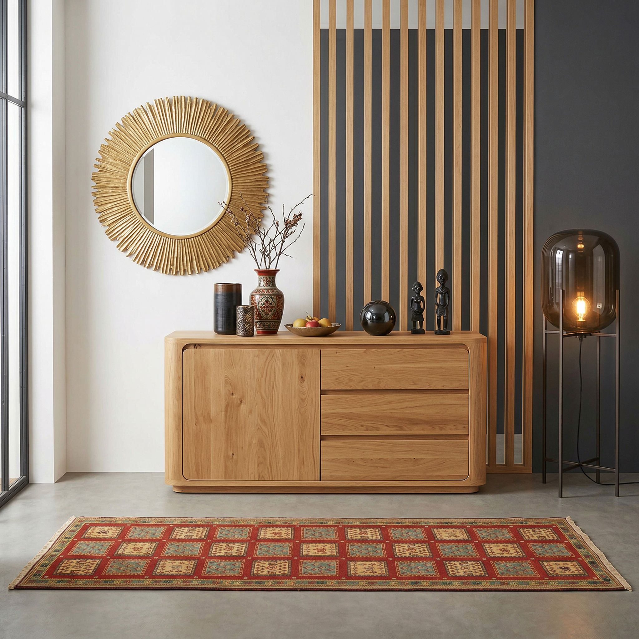 Obwohl der Skandi-Stil oft zurückhaltend ist, dient dieser hochwertige Kelim als bewusster, wärmender Akzent, der den "Hygge"-Faktor maßgeblich erhöht. Die klare Geometrie des Musters fügt sich in die skandinavische Formensprache ein, während die satten Farben das Einerlei aus Weiß- und Grautönen wirkungsvoll durchbrechen. Gefertigt aus reiner, handversponnener Naturwolle, entspricht er dem nordischen Anspruch an Nachhaltigkeit und kompromisslose Materialqualität. Er ist der perfekte Stilbruch, um einem minimalistischen Raum Charakter und haptische Wärme zu verleihen, ohne ihn zu überladen.