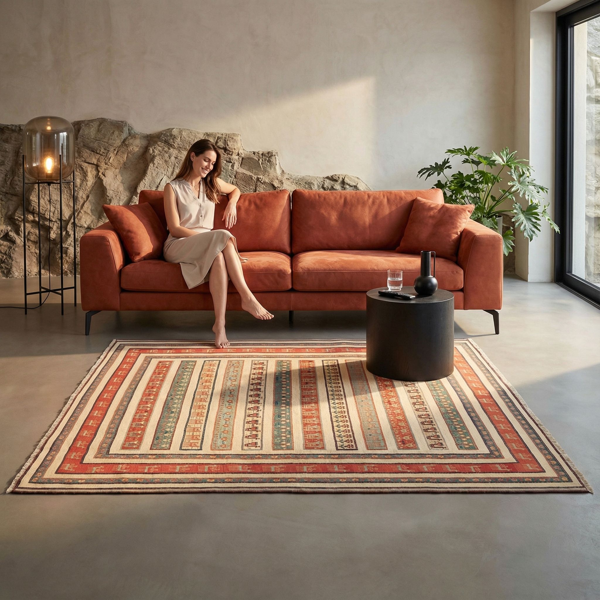 In einem cleanen Contemporary-Ambiente fungiert dieser feine Sumack-Kelim als exklusiver Stilbruch, der minimalistischen Räumen emotionale Tiefe und Textur verleiht, ohne sie zu überladen. Die lineare Anordnung der Motive schafft eine geometrische Ordnung, die wunderbar mit modernen, geradlinigen Möbeln kommuniziert, während die Naturfarben einen warmen Kontrapunkt zu kühlem Glas und Chrom setzen. Die außergewöhnlich feine Verarbeitung und die flache, feste Struktur machen ihn zu einer Bodenskulptur, die höchsten Ansprüchen an Design und Qualität gerecht wird. Dieser Teppich beweist, dass wahrer Luxus in der Kombination aus zeitgenössischer Klarheit und meisterhafter, traditioneller Handarbeit liegt.