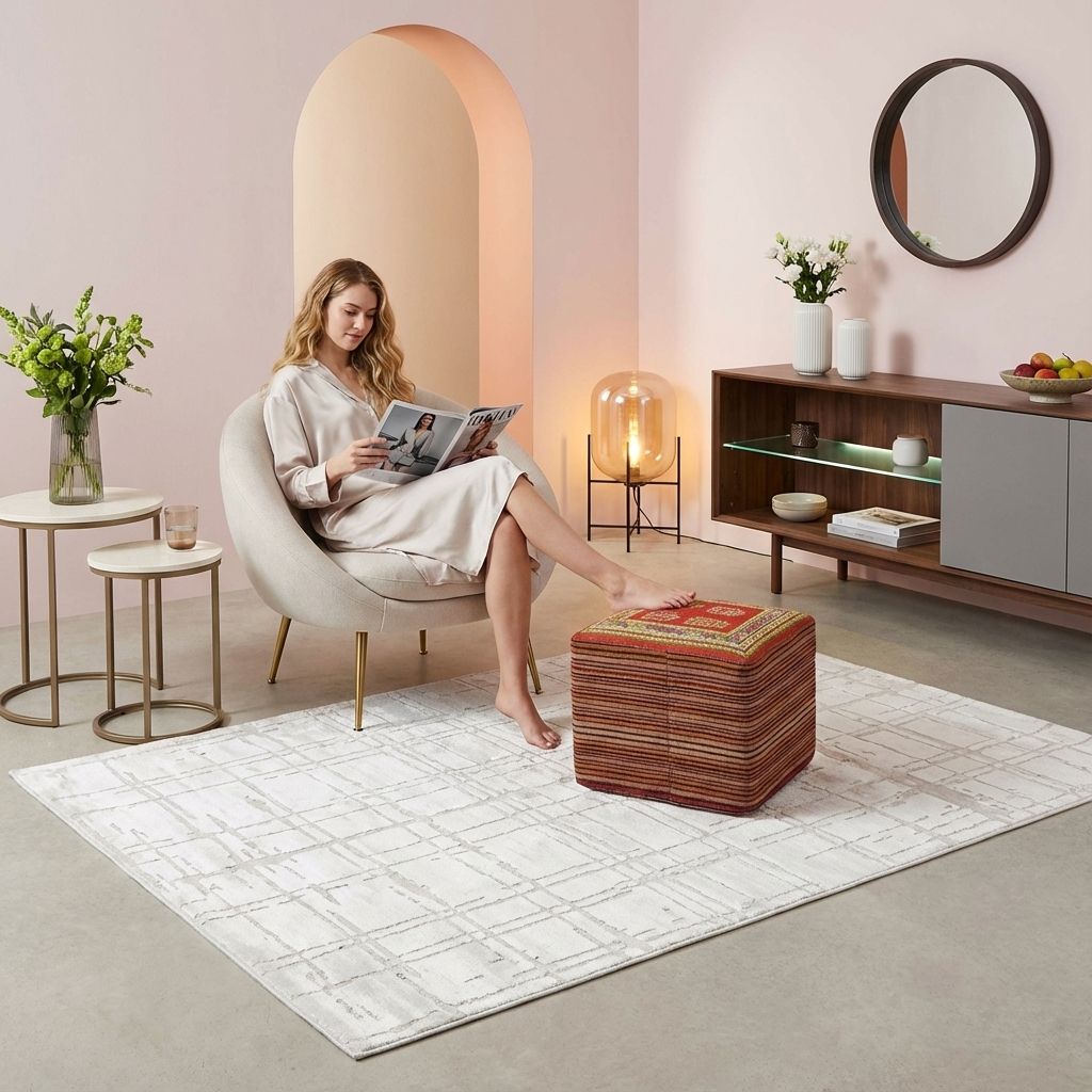 Afschar-Tabii-Sitzwürfel: Entdecken Sie unseren äußerst hochwertigen, vollständig handgemachten und langlebigen Sitzwürfel, der aus echten süd- und nordpersischen Webkelims gefertigt ist. Die Naturfarben und die handversponnene Schafwolle verleihen diesem vielseitig verwendbaren Hocker eine authentische und zeitlose Ausstrahlung. Die Oberseite besteht aus einem faszinierenden Afschar-Tabii-Sumack-Kelim, während alle fünf Seitenteile aus handgemachten alten und antiken Dscha-Dschim-Kelims bestehen (kein ...mehr Infos zur Herkunft