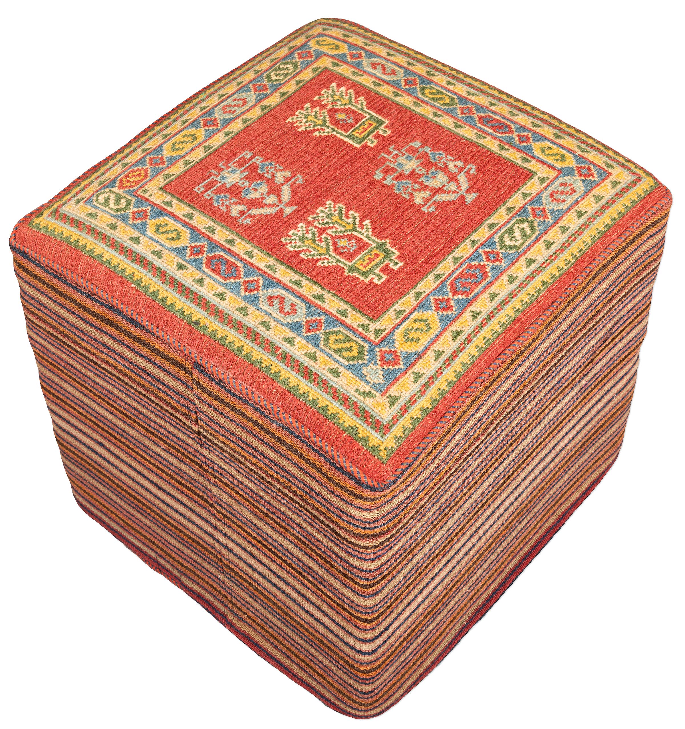 Hier präsentieren wir einen exquisiten Sitzwürfel, der mit einem Afschar-Tabii-Sumack-Kelim aus Persien bezogen ist. Die Hauptfarbe dieses Teppichs ist ein kräftiges Rot, das den zentralen Bereich dominiert und für eine warme und einladende Ausstrahlung sorgt. Umrahmt wird dieses Rot von einem harmonischen Zusammenspiel aus Gelb, Blau und Grün, die in geometrischen und floralen Mustern verwoben sind. Diese Farben verleihen dem Teppichbild eine lebendige und dennoch ausgewogene ...mehr Beschreibung