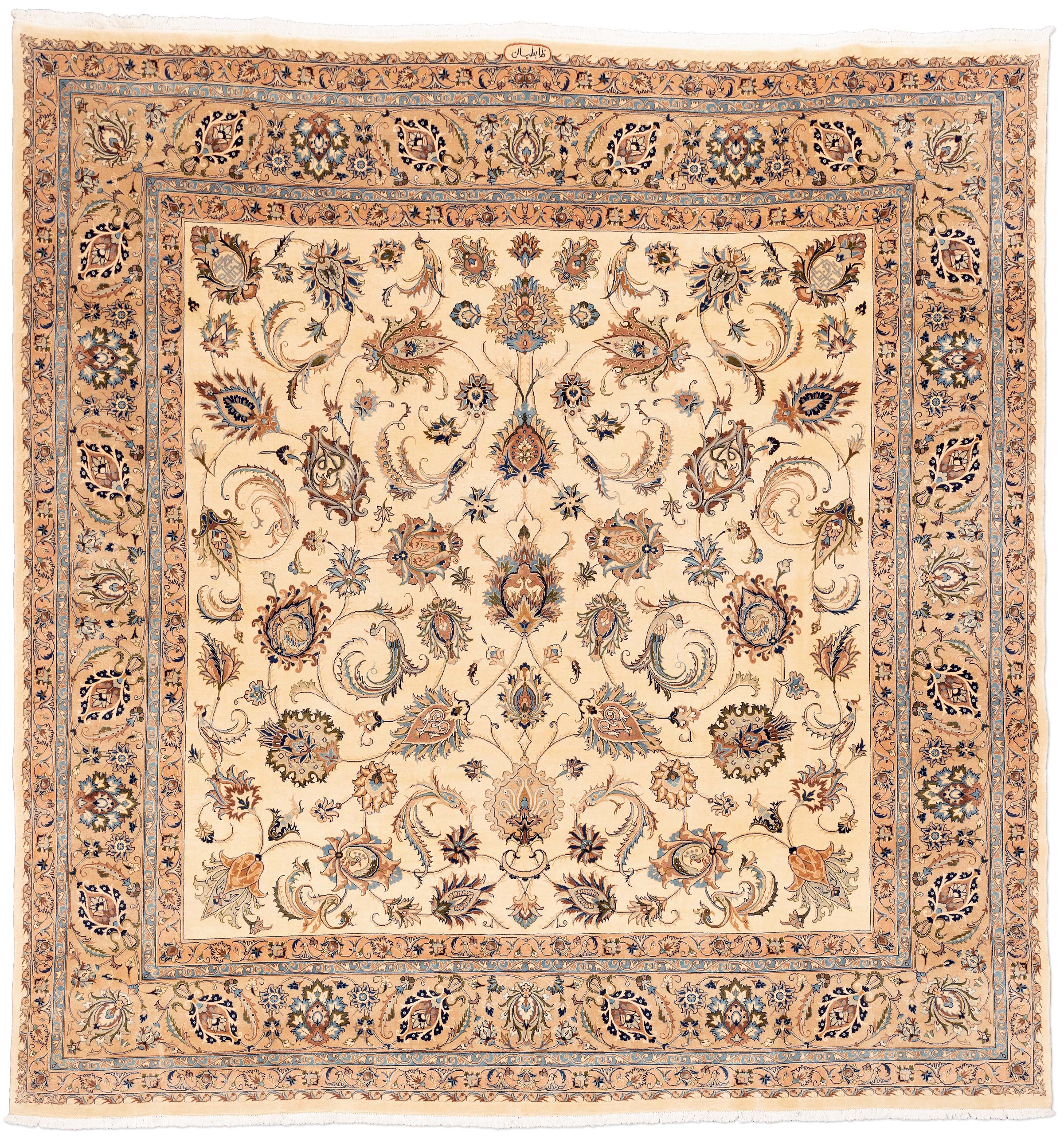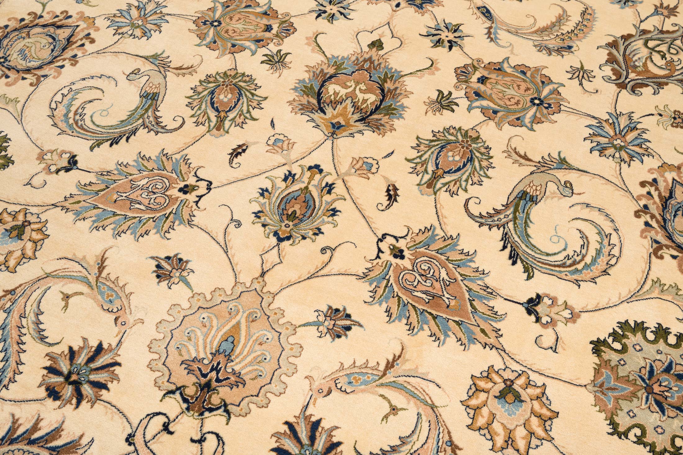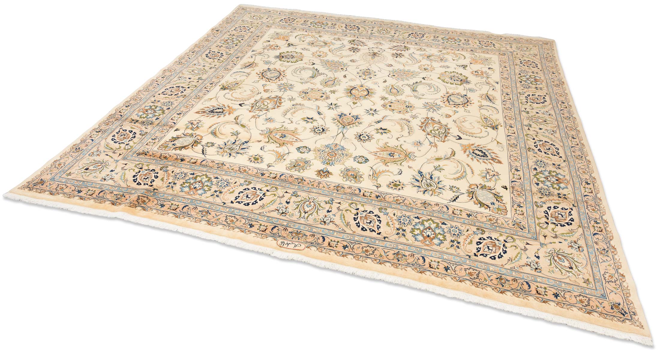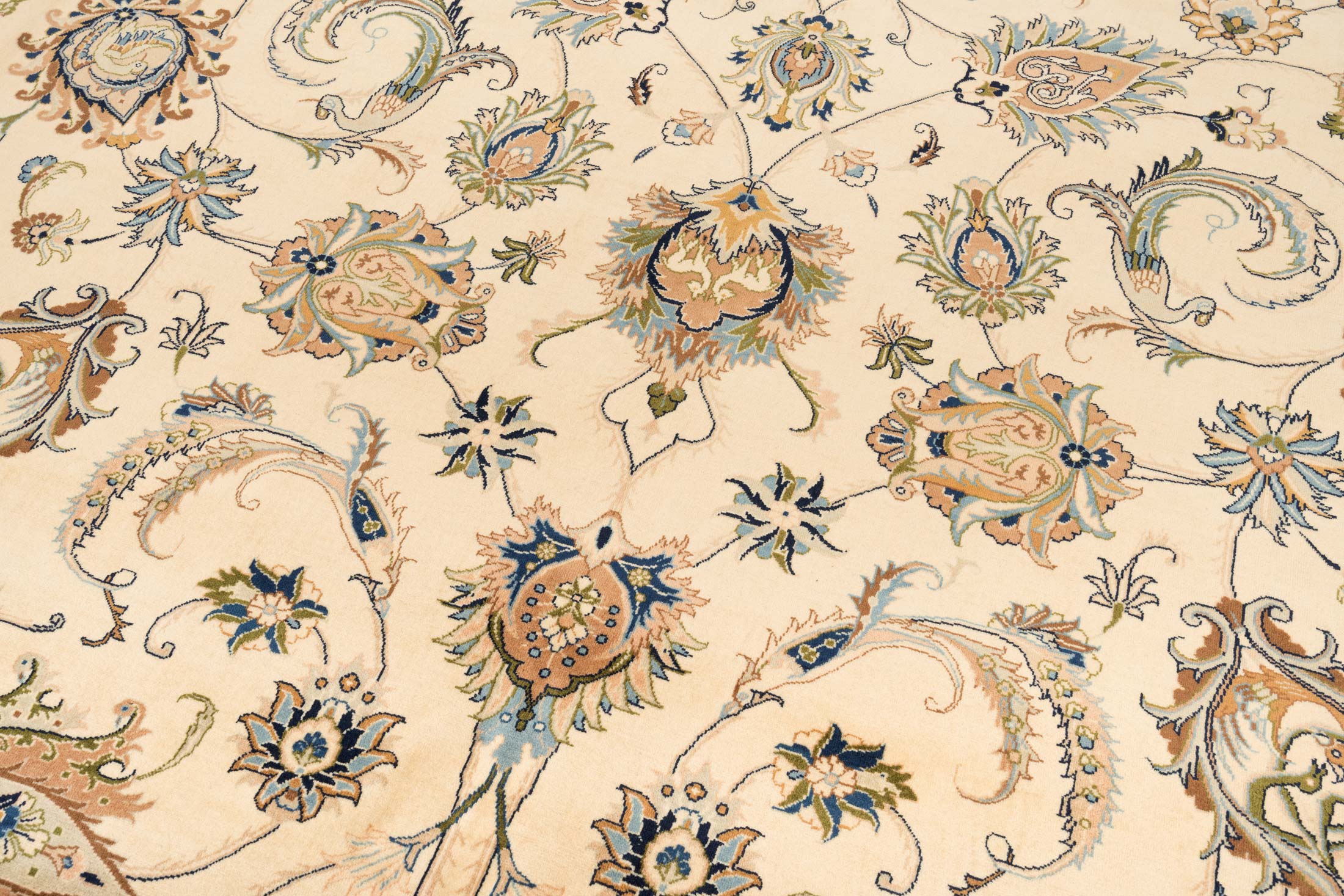 Dieser exquisite handgeknüpfte Kaschmar-Teppich aus Persien besticht durch seine harmonische Farbgebung und kunstvolle Musterung. Die Hauptfarbe ist ein elegantes Creme, das sich perfekt mit Akzenten in gedecktem Blau und warmem Braun ergänzt. Diese Farbpalette verleiht dem Teppich eine zeitlose Schönheit und passt wunderbar in jede Einrichtung. Die aufwendige Musterung zeigt florale Motive und verspielte Ranken, die kunstvoll miteinander verwoben sind. Gefertigt aus feiner Wolle und ...mehr Beschreibung