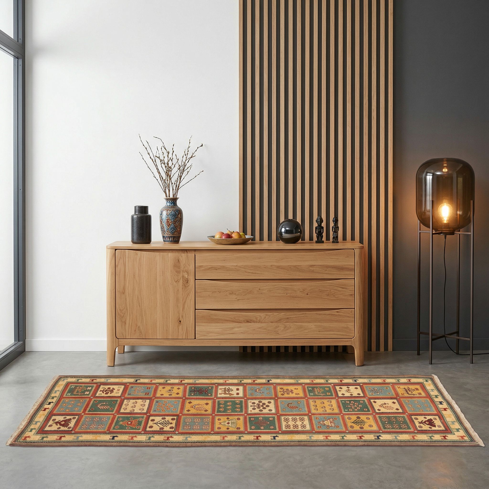 Im skandinavischen Stil dient dieser farbenfrohe Läufer als gezielter Akzent, der die monochrome Palette durchbricht und den wichtigen „Hygge“-Faktor integriert. Die hochwertigen Naturmaterialien und die griffige Struktur der Wolle bringen die nötige Wärme in die nordische Kühle, ohne die schlichte Eleganz zu überladen. Während die Möbel zurückhaltend bleiben, sorgt das geordnete Muster des Afschar-Tabii für einen strukturierten und dennoch verspielten Fokuspunkt im Raum. Diese Kombination aus persischer Tradition und nordeuropäischem Purismus erzeugt eine einzigartige, designorientierte Spannung.