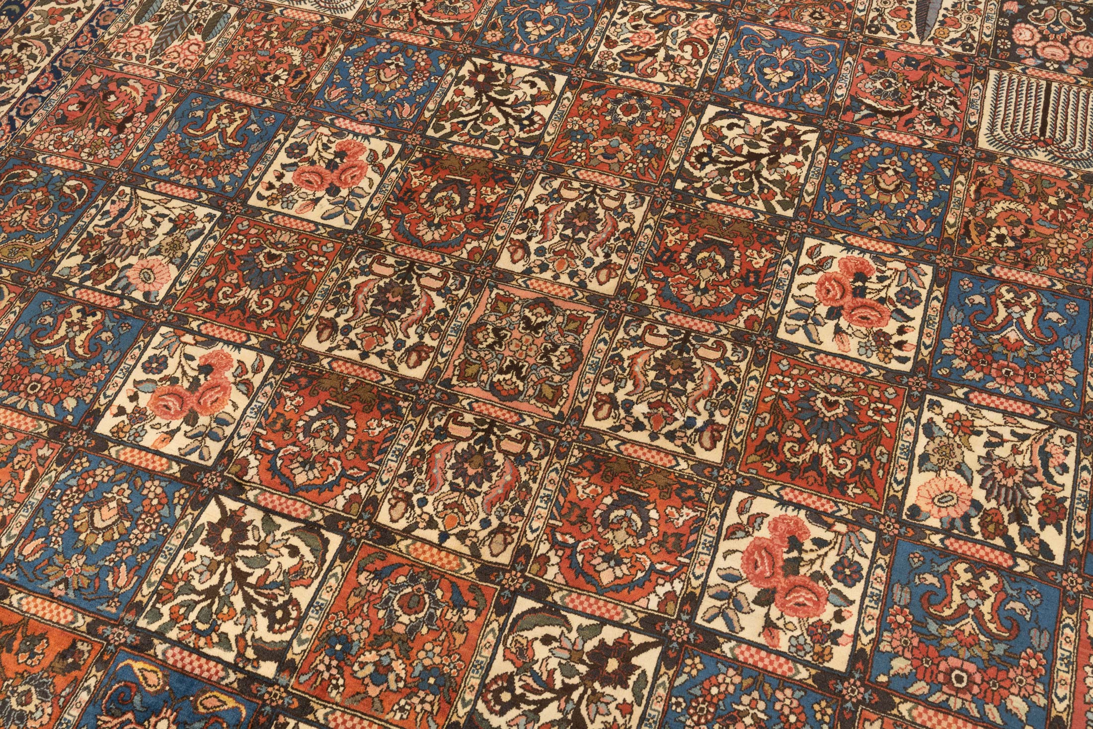 Dieser handgeknüpfte Bachtiar-Teppich aus Persien besticht durch seine herausragende Qualität und kunstvolle Gestaltung. Die Hauptfarbe dieses prächtigen Stücks ist ein tiefes Rot, das harmonisch mit einem satten Blau, warmem Beige und einem erdigen Braun kombiniert wird. Diese Farbpalette verleiht dem Teppich eine elegante und zugleich einladende Ausstrahlung. Die Muster bestehen aus raffinierten Medaillons und quadratisch angeordneten Feldern, die an ein traditionelles Gartenmuster ...mehr Beschreibung