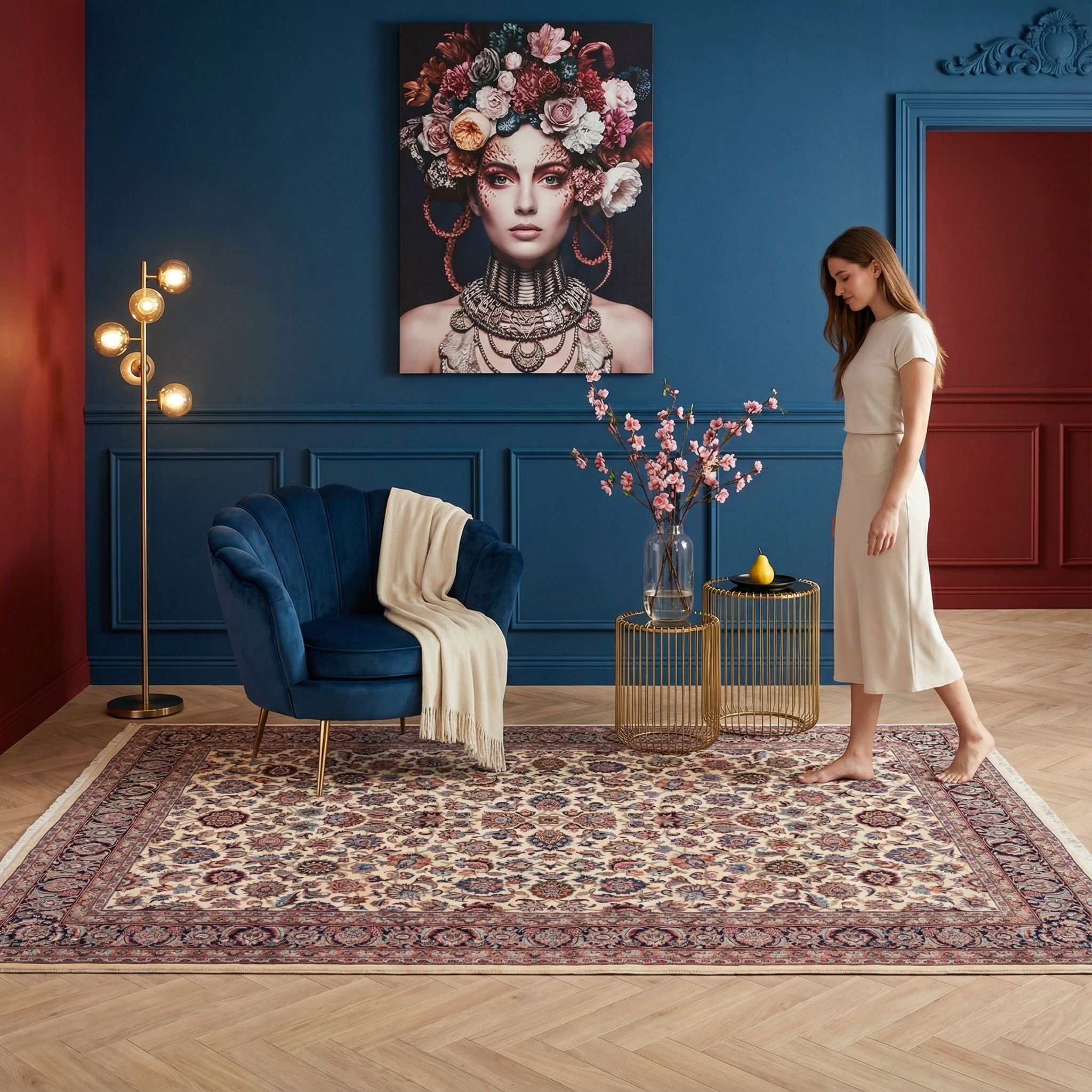 Da dieser Teppich explizit zur Spitzenqualität seiner Art zählt, passt er hervorragend in den luxuriösen und opulenten Glam-Style, der Wert auf Hochwertigkeit legt. Die extrem feine Knüpfung (ca. 390.000 Knoten) und die detailreiche Ornamentik strahlen eine Exklusivität aus, die wunderbar mit Samtsofas, Spiegeln und goldenen Akzenten korrespondiert. Der helle Untergrund lässt den Raum strahlen und bietet eine edle Bühne für glänzende Accessoires und prunkvolle Kronleuchter. Mit seiner seltenen Farbstellung unterstreicht er den Anspruch auf Einzigartigkeit und glamouröse Eleganz im Wohnbereich.
