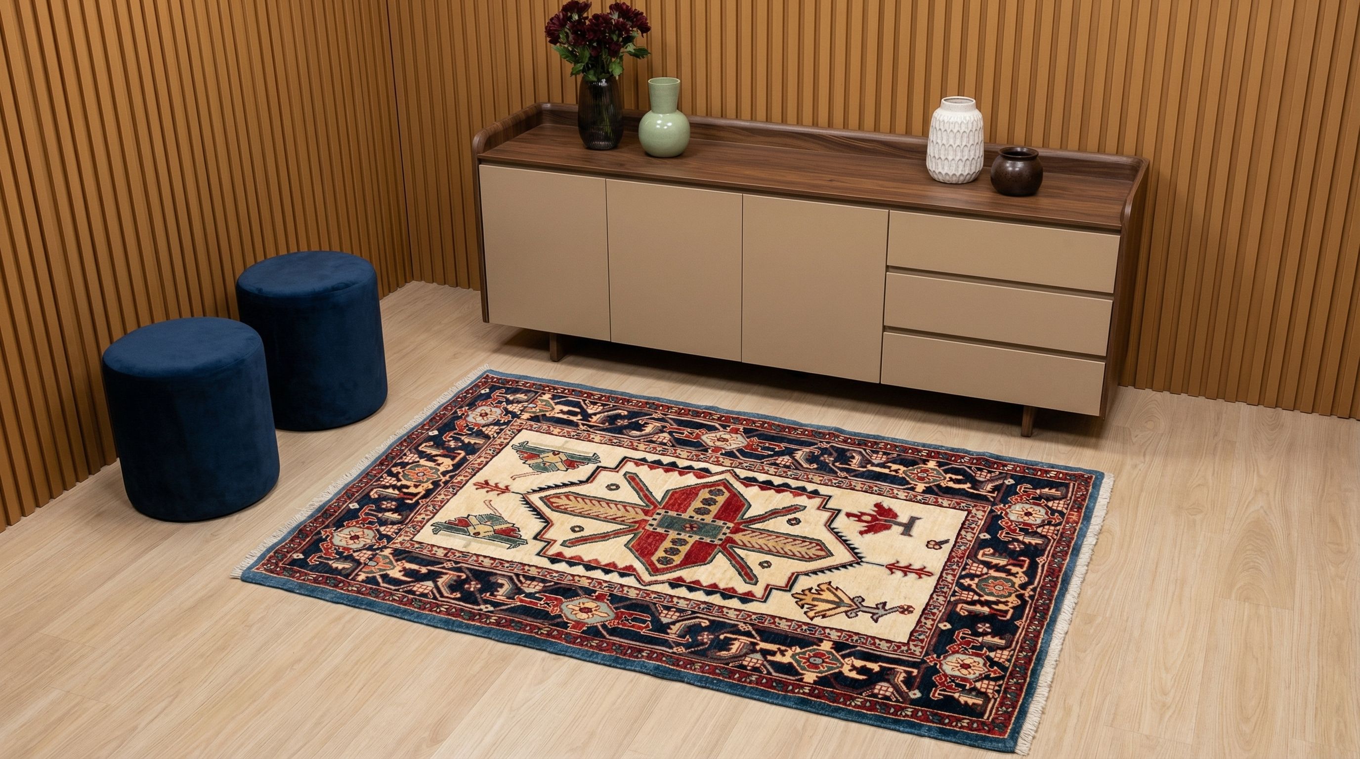 Dieser handgeknüpfte Teppich aus dem Hause Mesgarzadeh präsentiert sich in einer harmonischen Kombination aus Naturfarben, die ihm seinen einzigartigen Charakter verleihen. Die Hauptfarbe ist ein sanftes Creme, das die Grundlage des Designs bildet und einen warmen, einladenden Eindruck hinterlässt. Ergänzt wird diese durch ein tiefes Blau, das in der Bordüre und den zentralen Musterelementen hervortritt. Ein lebhaftes Rot, das an warmes Backsteinrot erinnert, setzt lebendige Akzente und ...mehr Beschreibung